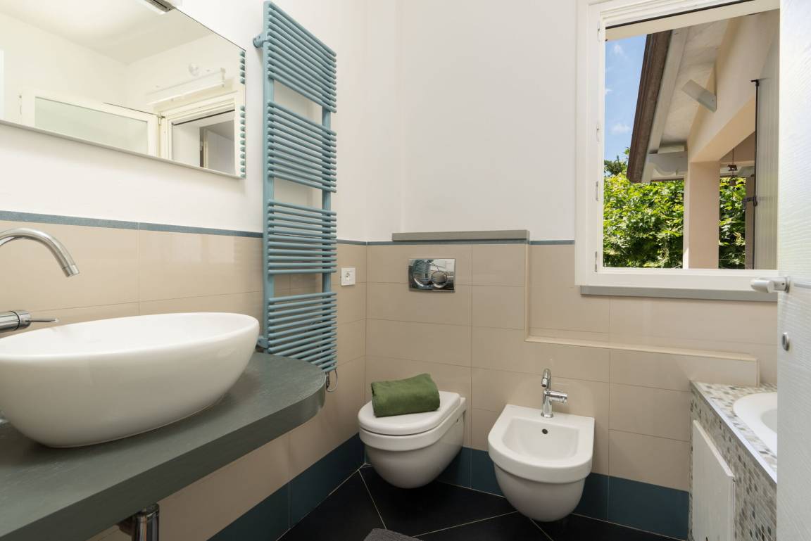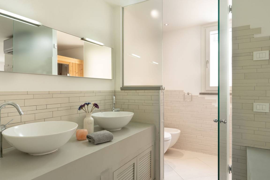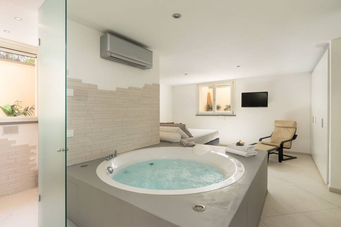 Schlafzimmer mit Bad: Doppelbett, WiFi Internet, Klimaanlage, Whirlpool-Badewanne, Doppelwaschbecken, WC, Bidet.