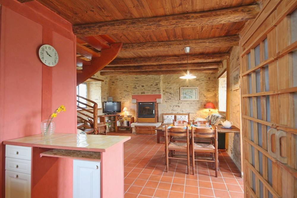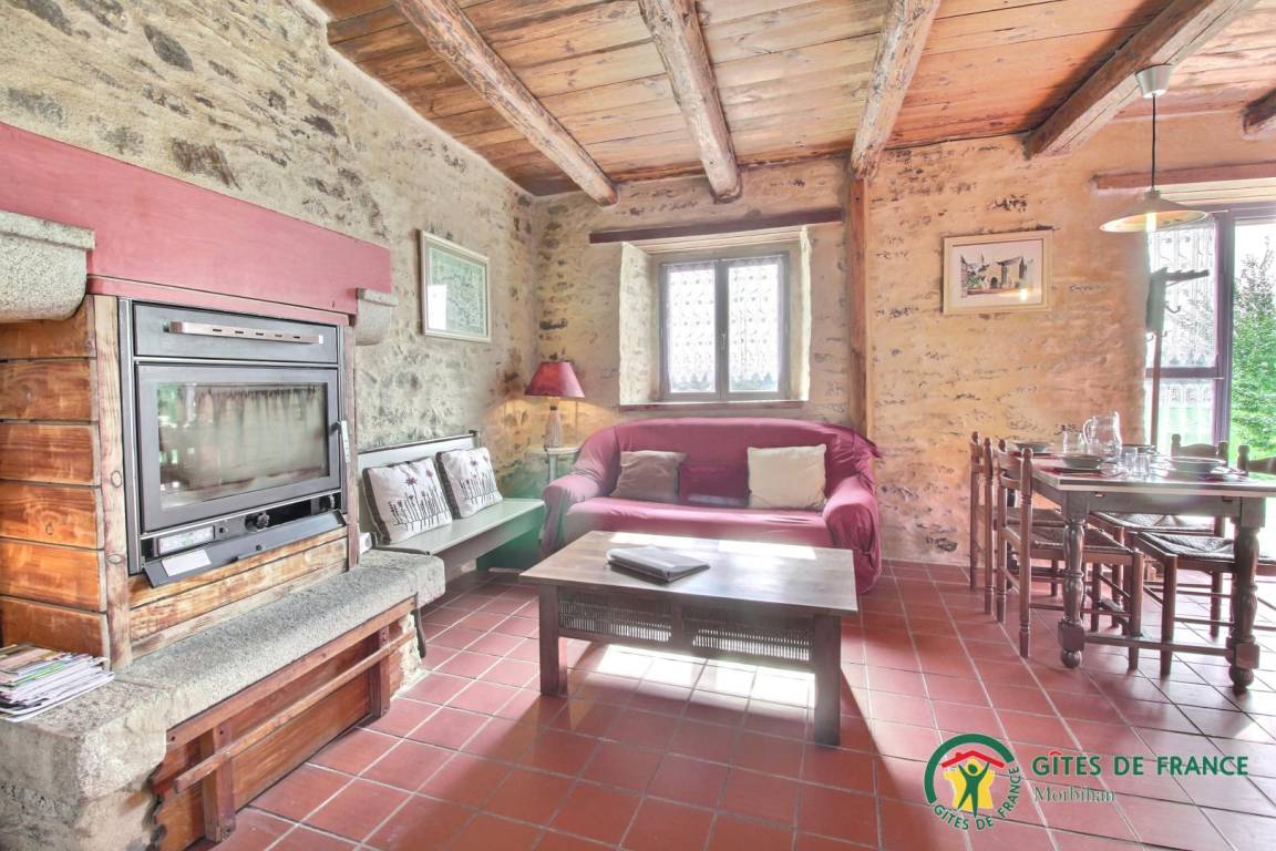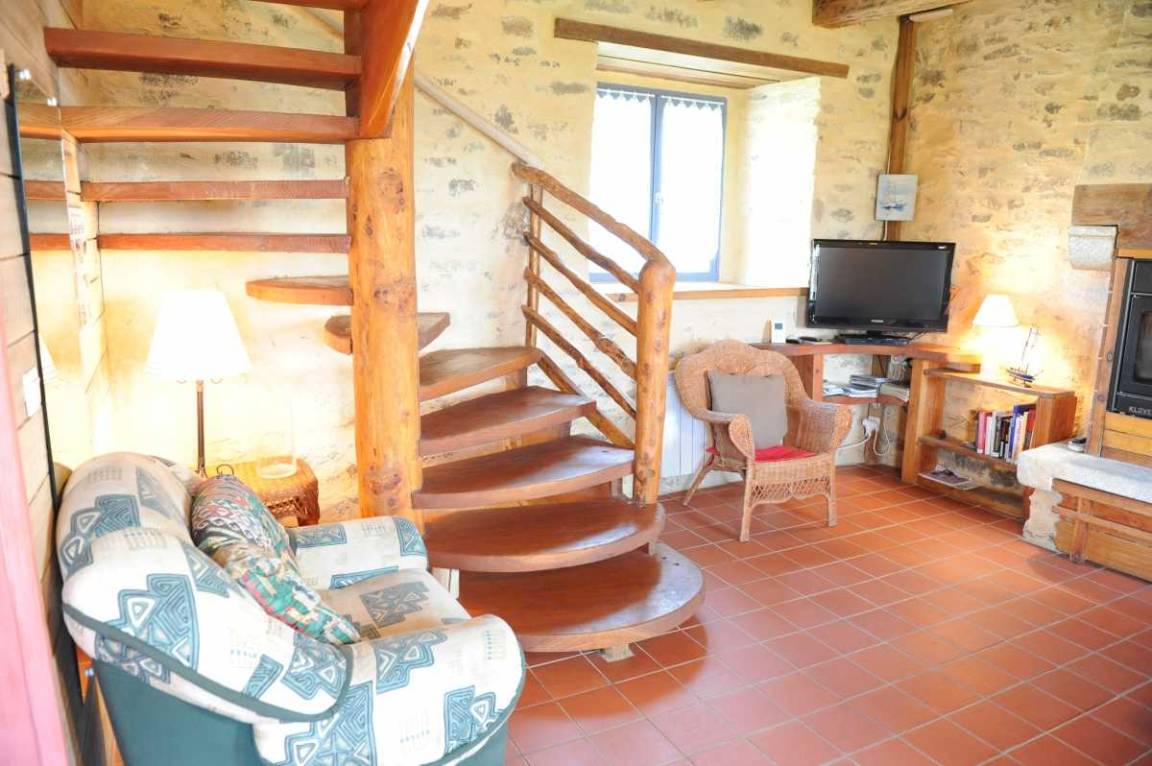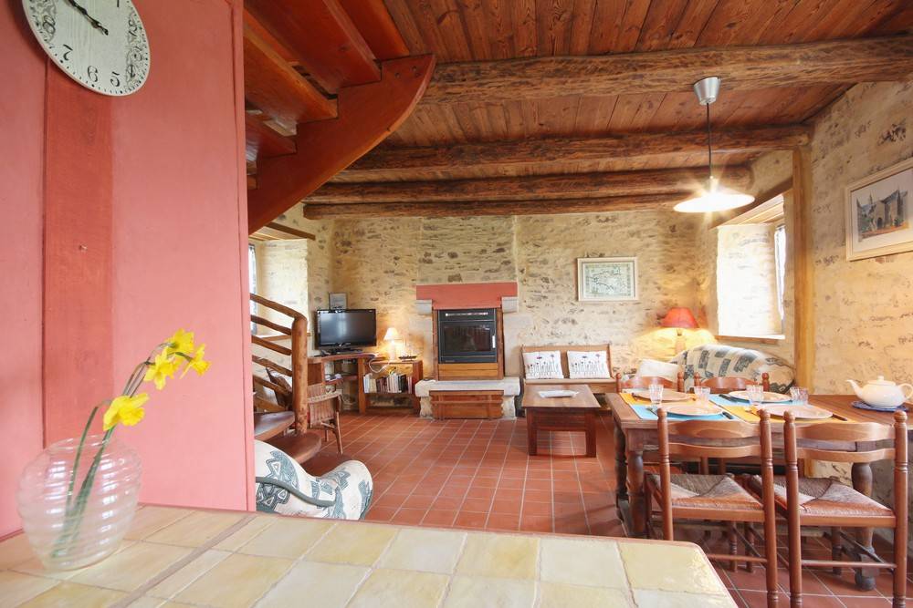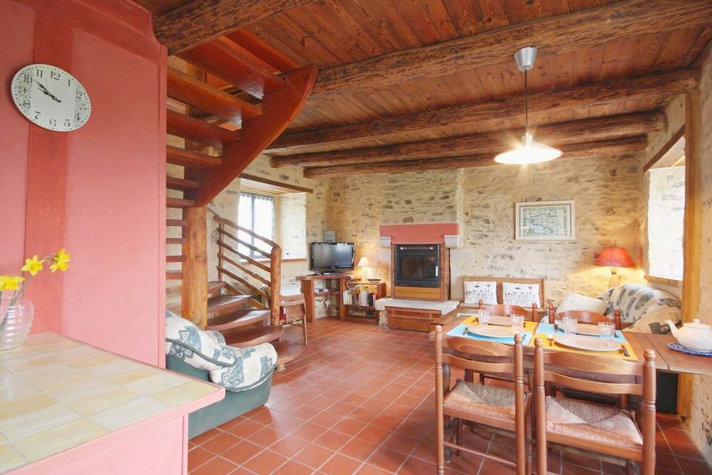 - Im Erdgeschoss: ein Wohnzimmer / Küche / Wohnzimmer, Kamin (Holzpelletseinsatz), ein Badezimmer, eine Toilette.