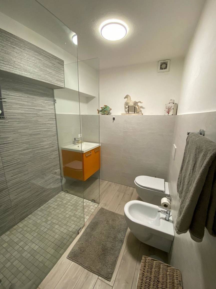 Designerbad mit Dusche, zwei Waschbecken, WC, Bidet.