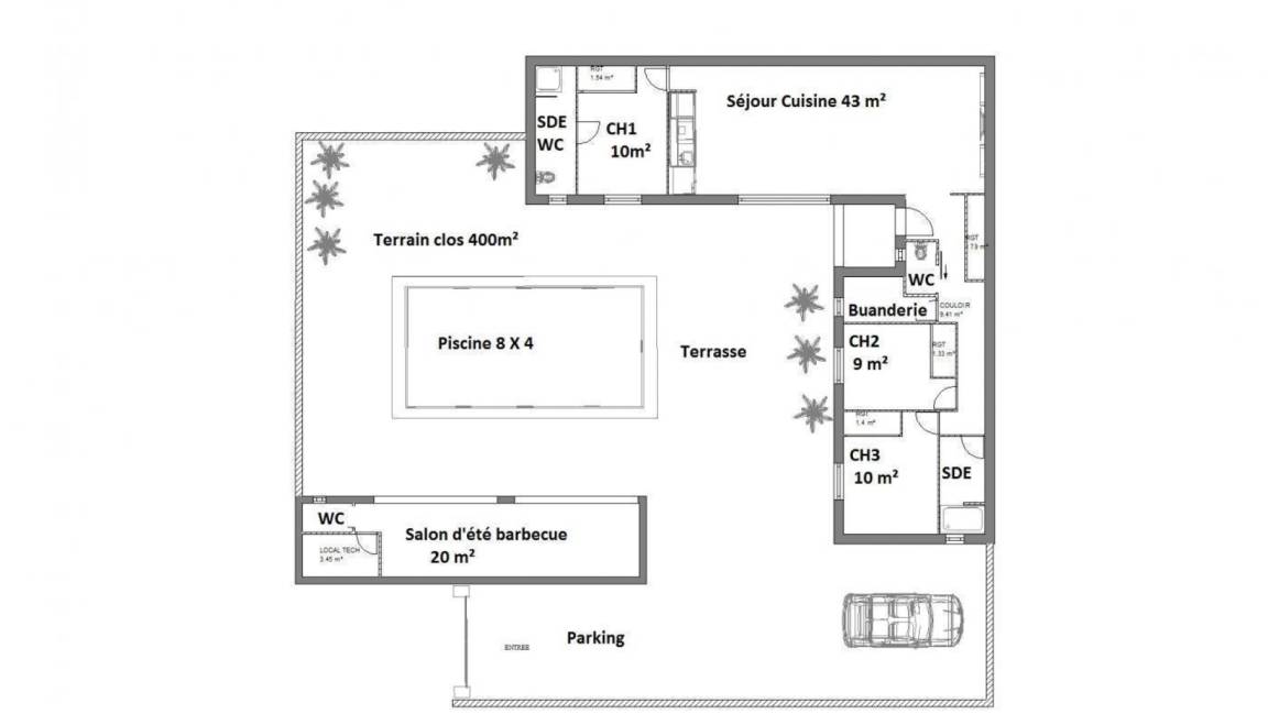 Self catering Erdgeschoss umfasst eine große Wohnküche. 1 Zimmer mit Dusche - WC (1 Bett 160). 2 Schlafzimmer (1 Bett 160 und 2 Betten in 90). SDE. Unabhängiges WC. Waschküche mit Trockner. Umschaltbare Klimaanlage ganzjährig enthalten.