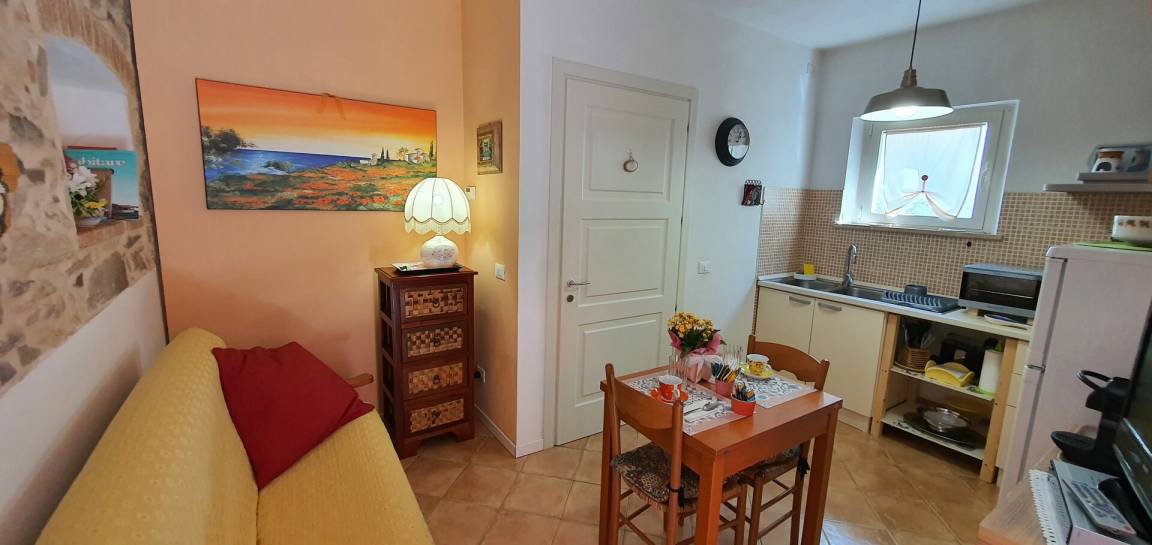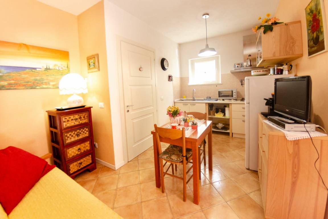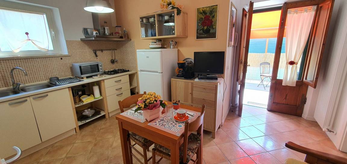 Küche: Esstisch (Personen: 3), Kühlschrank, Tiefkühler, Herd, Ofen, Toaster, Bügeleisen, Italienische Kaffeemaschine, WiFi Internet, Fliegengitter, Satelliten-TV, Ausgang auf den Patio, Sofa.