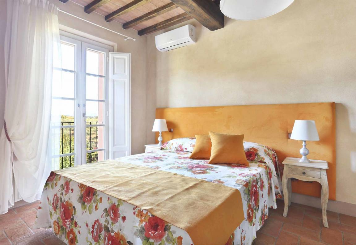 Schlafzimmer mit Bad 1: Doppelbett, WiFi Internet, Klimaanlage, Waschbecken, WC, Bidet, Dusche, Fön, Ausgang auf den Balkon.