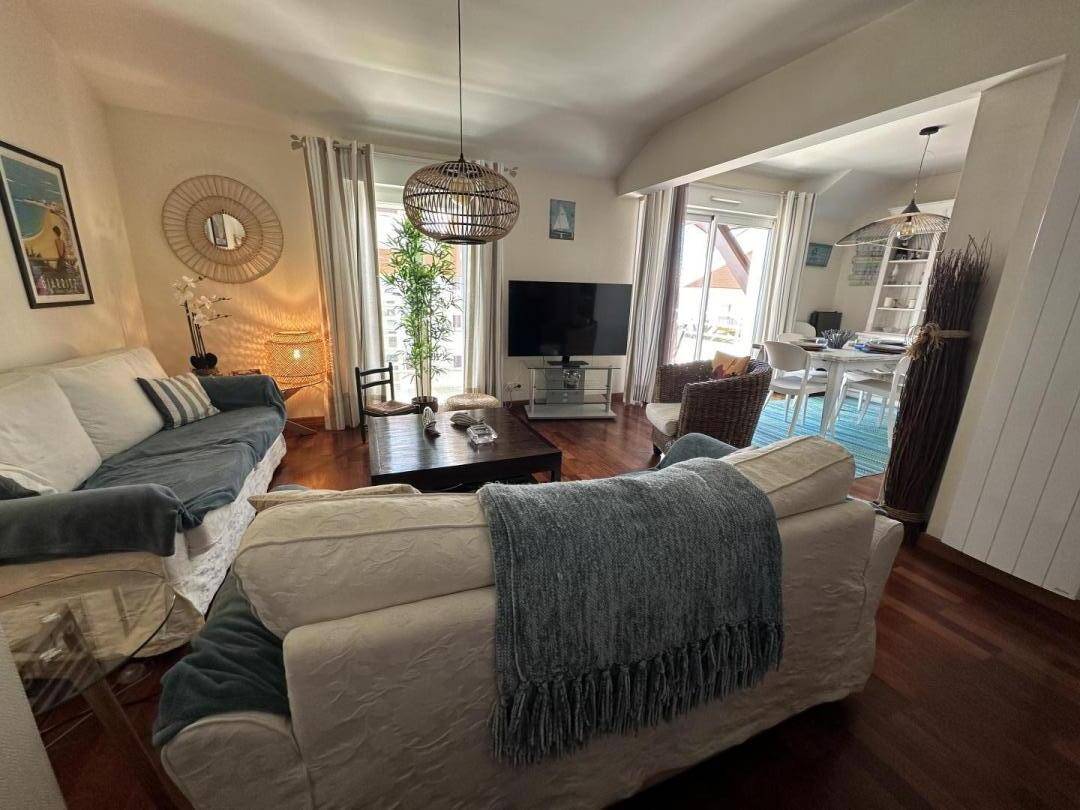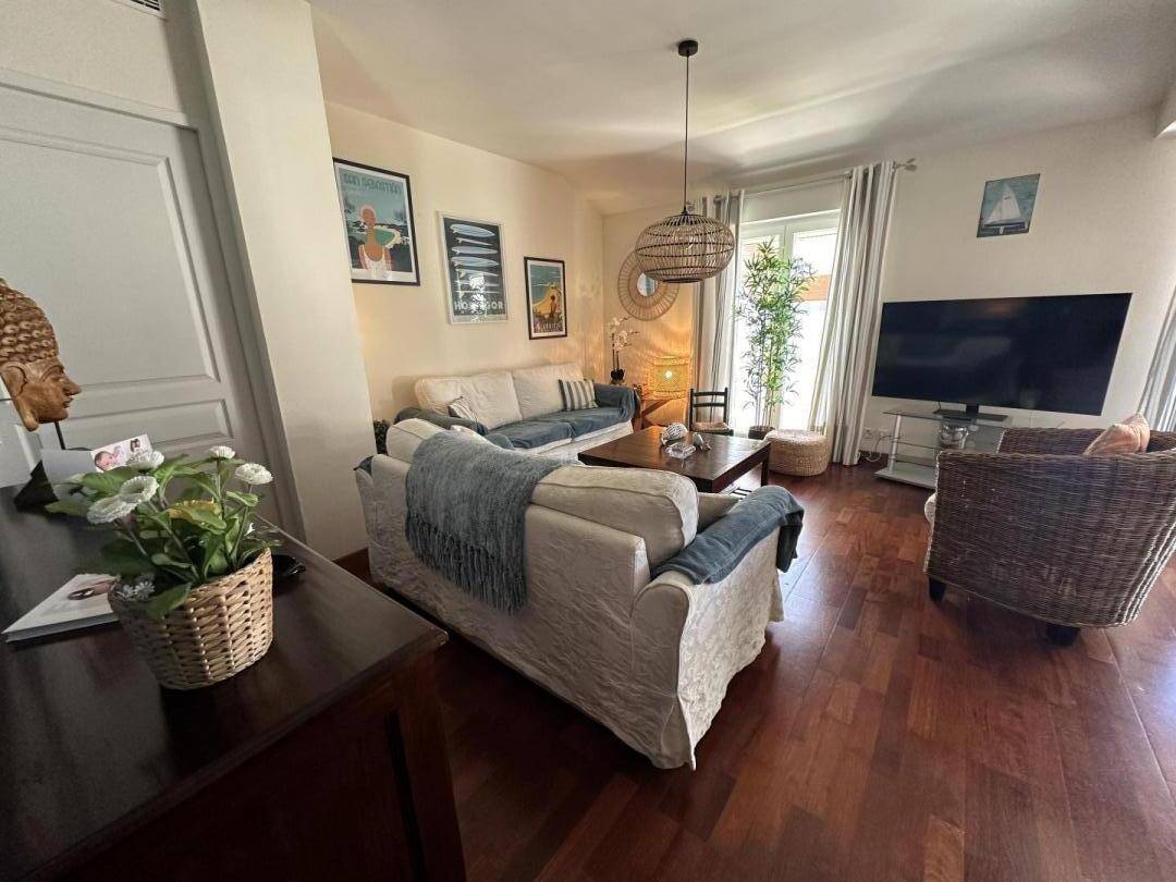 - Wohnbereich mit Sofas, Couchtisch und Fernseher, My Canal, mit Zugang zur Terrasse