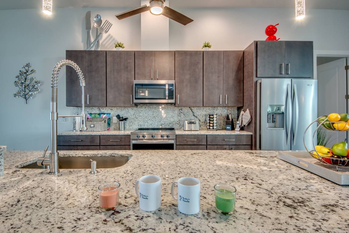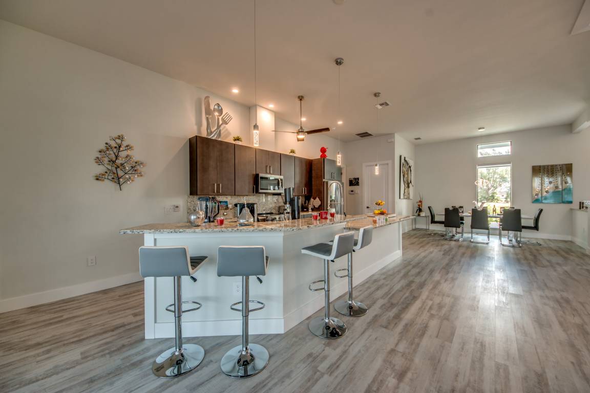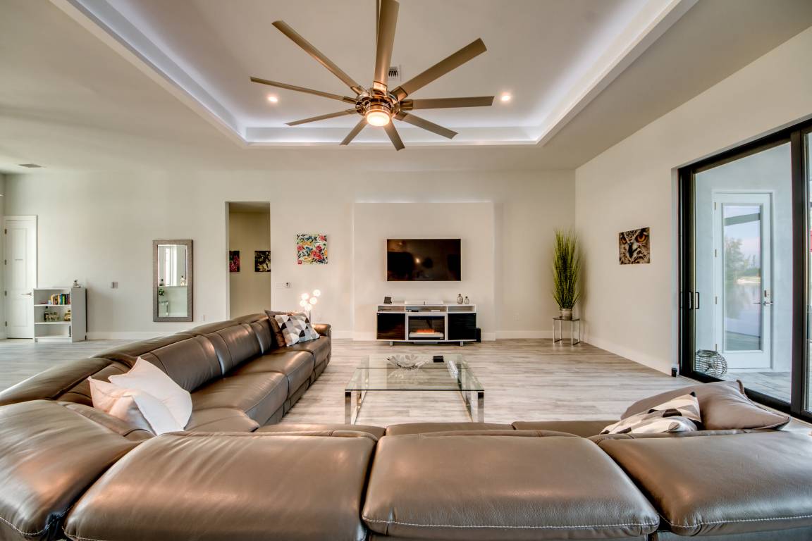 Im großen Wohnbereich lädt eine Couchlandschaft vor dem Entertainment-Center zum verweilen ein. Der 65" große LED-Fernseher verfügt über Netflix, Amazon Prime und bietet über das Sonos-System optimales Kinofeeling. Wem auch in Florida nach Winterstimmung ist, kann den vorhandenen Elektrokamin anschalten und sich vor dem Ambiente-Kaminfeuer einen Glühwein gönnen.