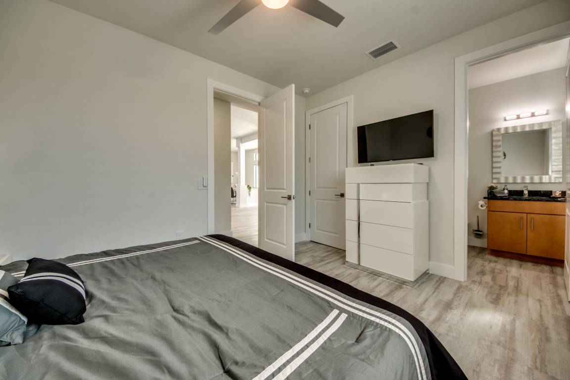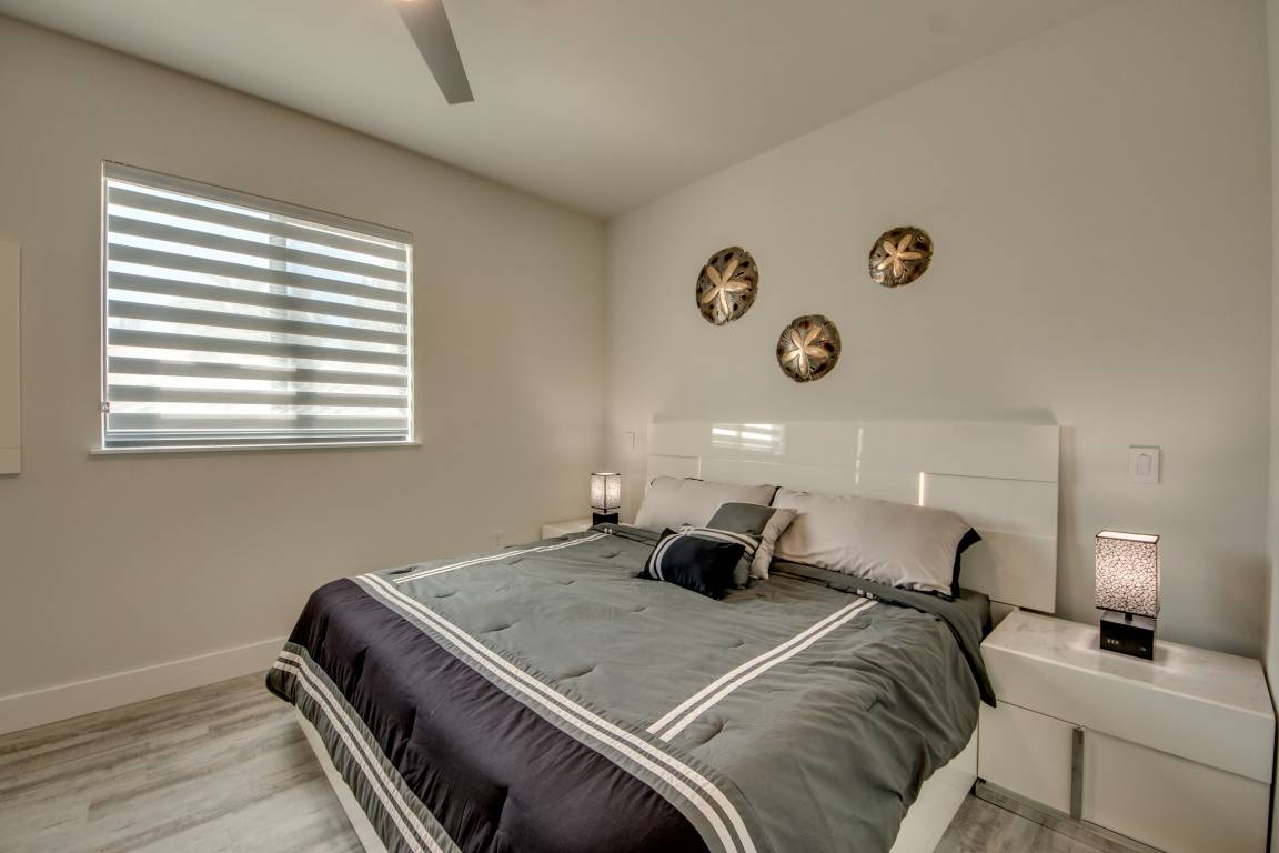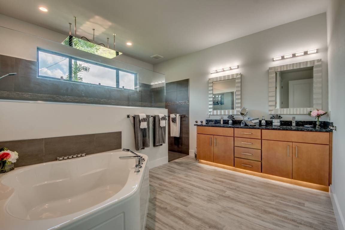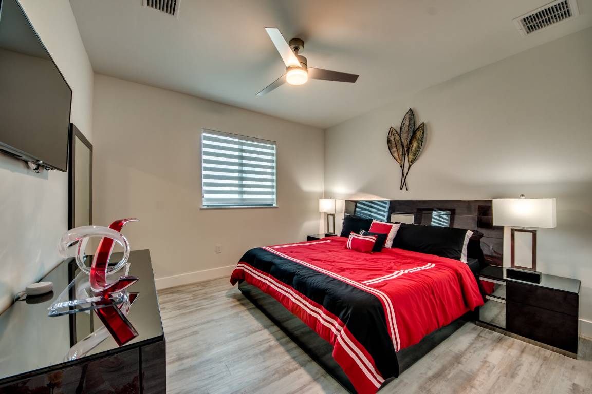 Die beiden Schlafzimmer im linken Flügel verfügen jeweils über ein eigenes kleines Badezimmer mit Waschgelegenheit/WC und einem begehbaren Kleiderschrank. Über den kleinen Flur sind beide Schlafzimmer mit dem 18m² großen Master-Bath verbunden. Dort können Sie neben der sehr geräumigen Dusche mit XXL-LED-Regendusche auch eine Badewanne nutzen. Das hintere der beiden Schlafzimmer ist wiederum über eine Terassentür direkt mit der Lanai und der Poollandschaft verbunden.