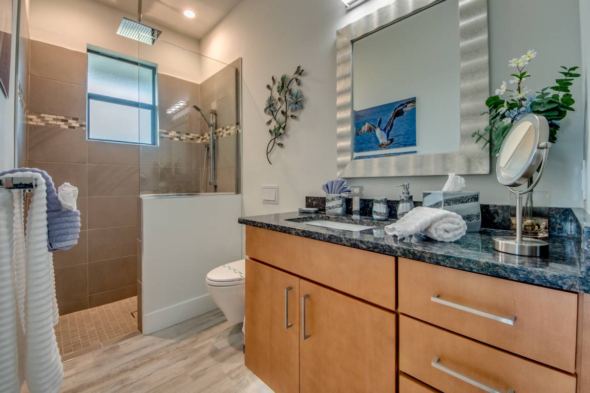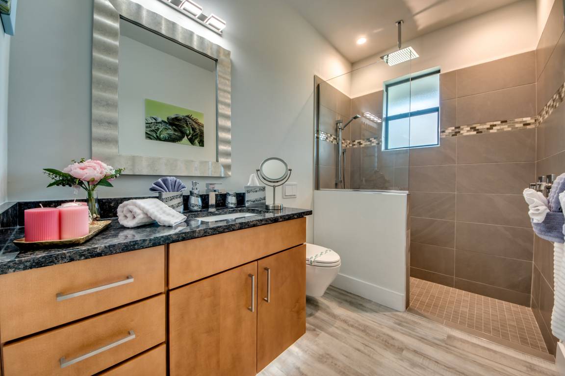 Die beiden Schlafzimmer im rechten Flügel verfügen jeweils über ein eigenes Bad mit Dusche/WC und einem großen Einbauschrank für die Kleidung. Eines der Schlafzimmer ist über eine Terrassentür direkt mit der Lanai und der Poollandschaft verbunden.