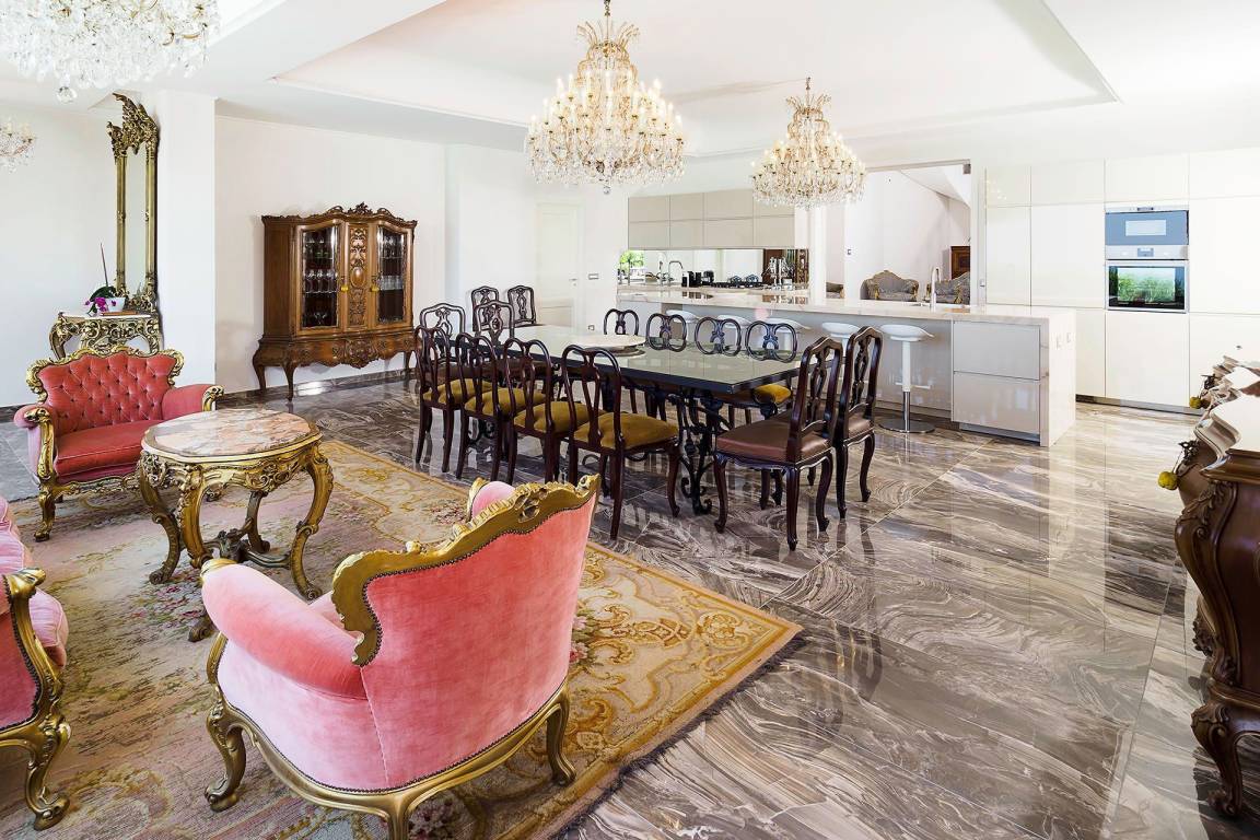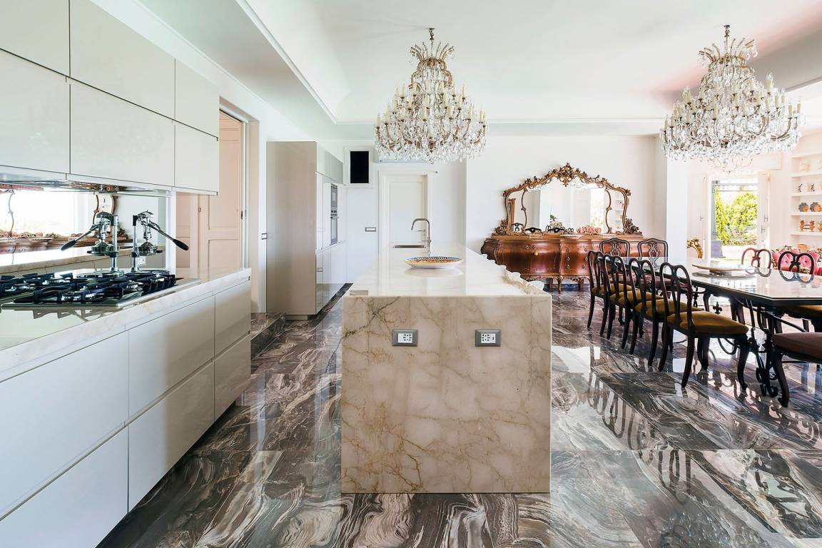 Die Villa umfasst insgesamt 5 Schlafzimmer und 6 Bäder und bietet Platz für bis zu 10 Gäste auf mehreren Ebenen. Die Raumaufteilung trennt Wohn- und Schlafbereiche funktional voneinander und schafft damit eine klare Gliederung zwischen gemeinschaftlich genutzten Räumen und privaten Rückzugsräumen.