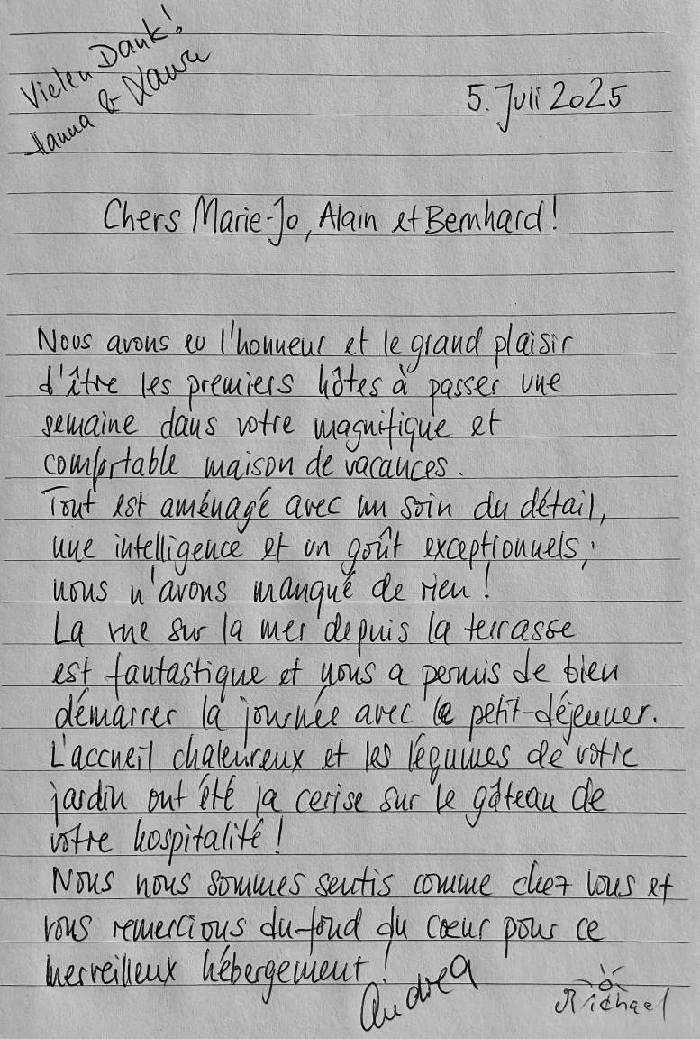 „Herrliches Les Canivelles! Ein Gite als wenn man nach Hause kommt mit so freundlichen Gastgebern, so dass der Urlaub gleich beginnen kann. Ein so schönes, großzügiges Haus, in dem nichts fehlt, mit Meerblick, herrlicher Terrasse, großem Garten. Wir haben uns als Familie rundum wohlgefühlt!“