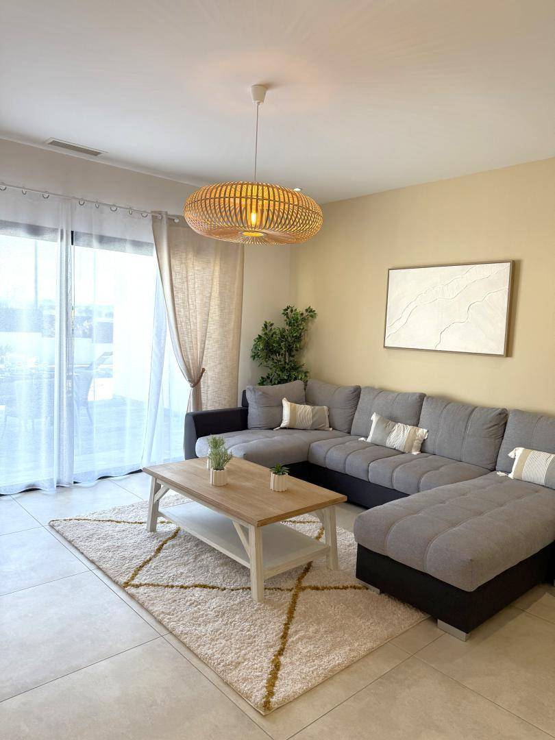 _Wohnzimmer mit Sitzecke, Fernseher mit Heimkino, Einbauküche (Herd, Backofen, Waschmaschine, Dolce Gusto-Pad-Kaffeemaschine, Kühlschrank mit Gefrierfach),