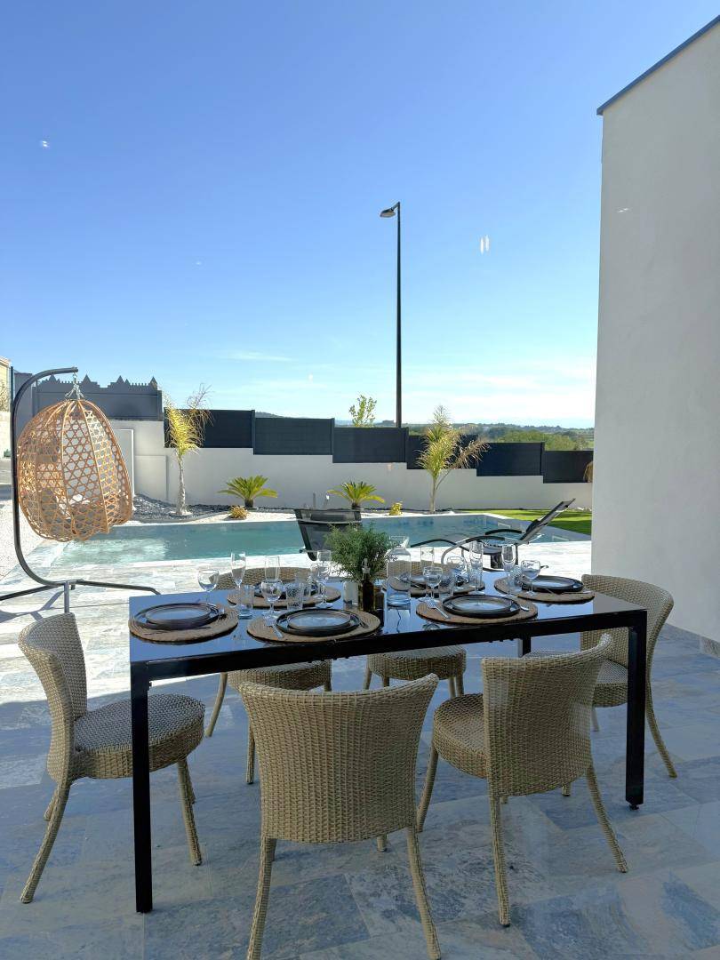 Eine kleine überdachte Terrasse mit Gartenmöbeln befindet sich am Eingang des Ferienhauses.