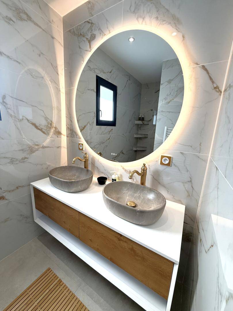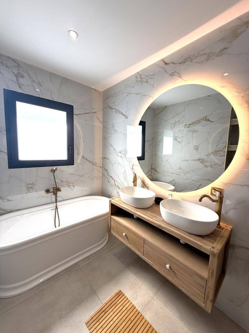 Obergeschoss: eine Suite mit einem 140 cm breiten Bett, ebenerdiger Dusche und Waschbecken, Fernseher.