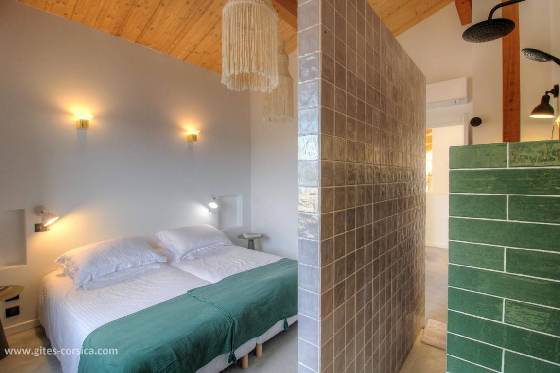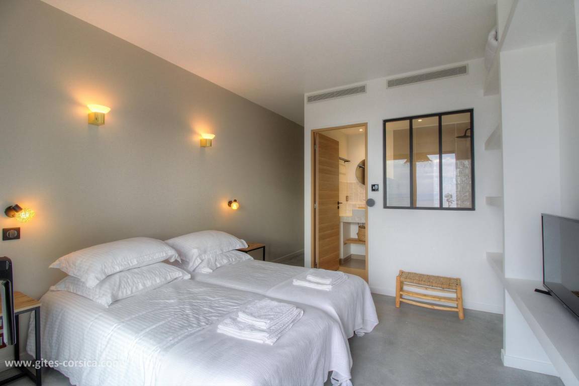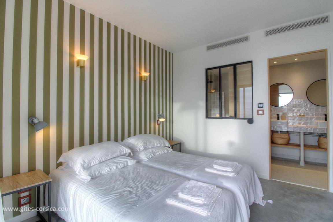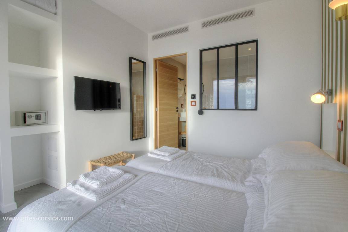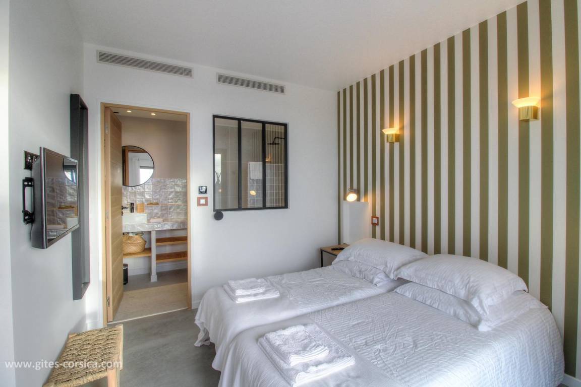 - 1 Schlafzimmer mit 2 Betten 80x190 cm, die zusammengestellt werden können, mit eigenem Bad, offen zum Schlafzimmer.