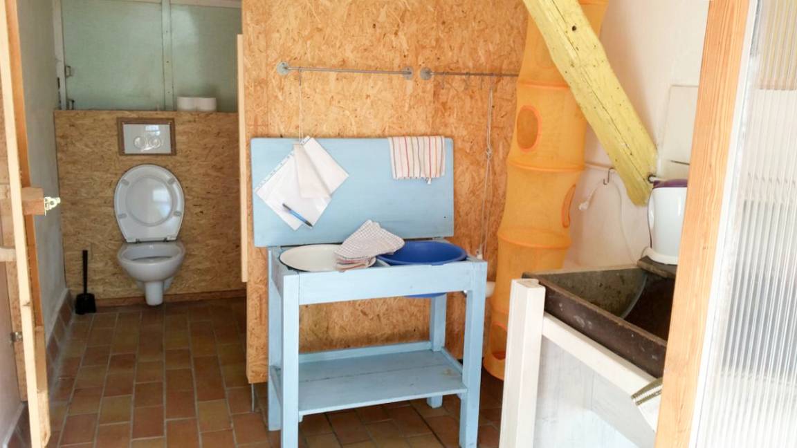 Das "Bad" ist in einem abgeranzten Schuppen, 20 Meter entfernt.