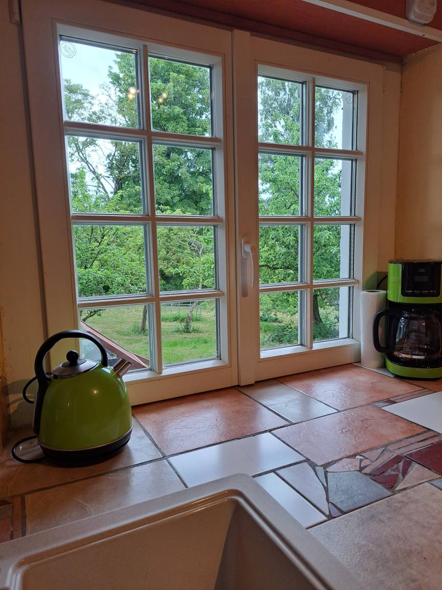 Besonderes Highlight: Die sonnige Terrasse direkt an der Küche mit freiem Blick in den grünen Garten – ideal für ein Frühstück im Morgentau oder einen entspannten Abend mit Vogelgezwitscher und weitem Himmel.