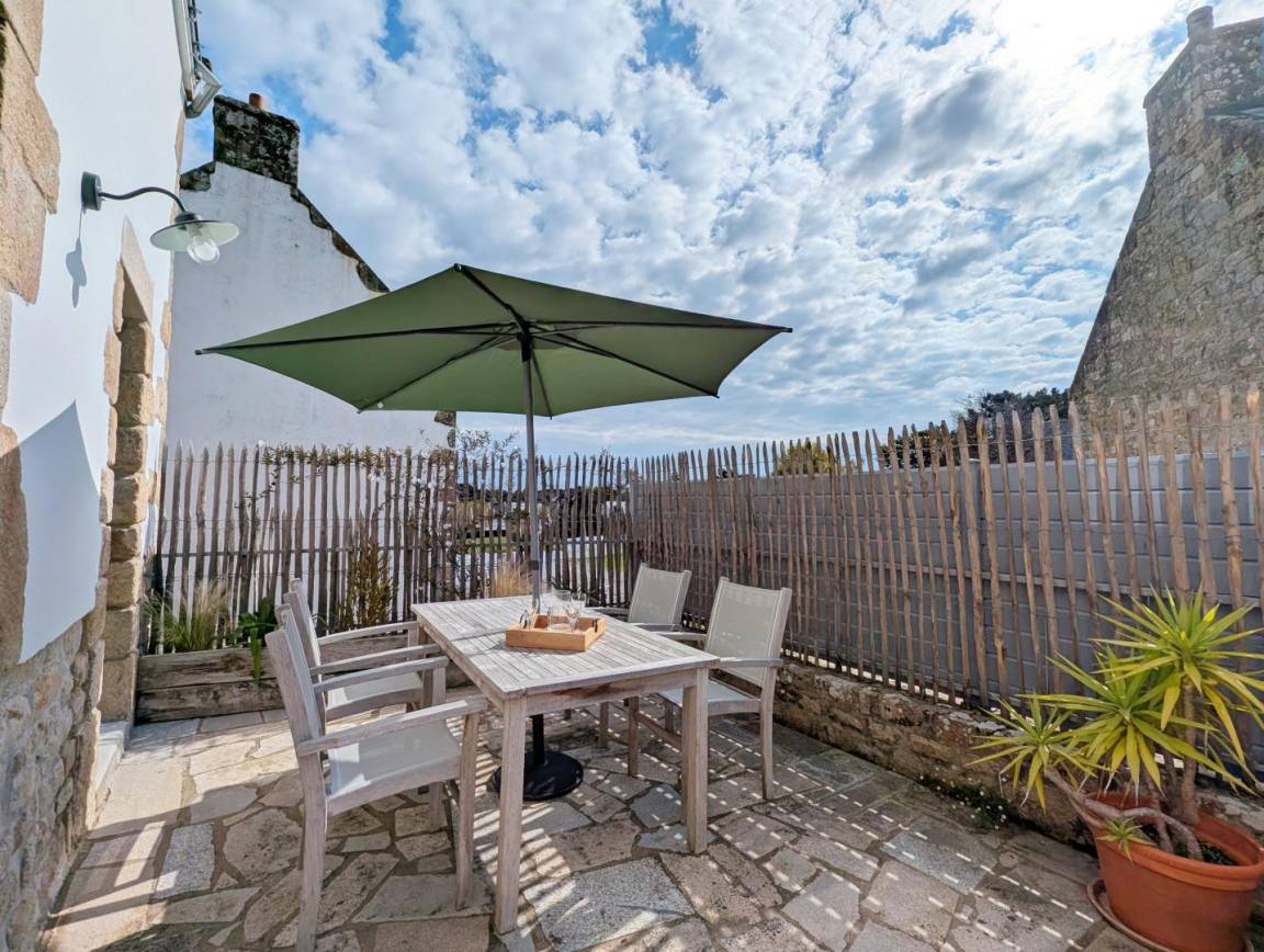 Eine Südterrasse mit Esstisch und Sonnenschirm.