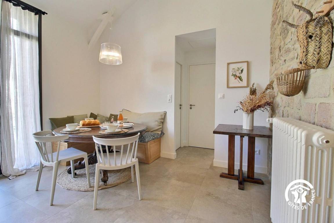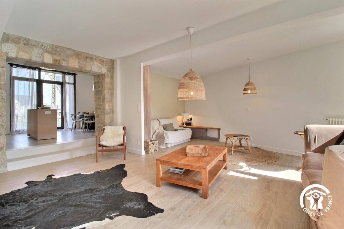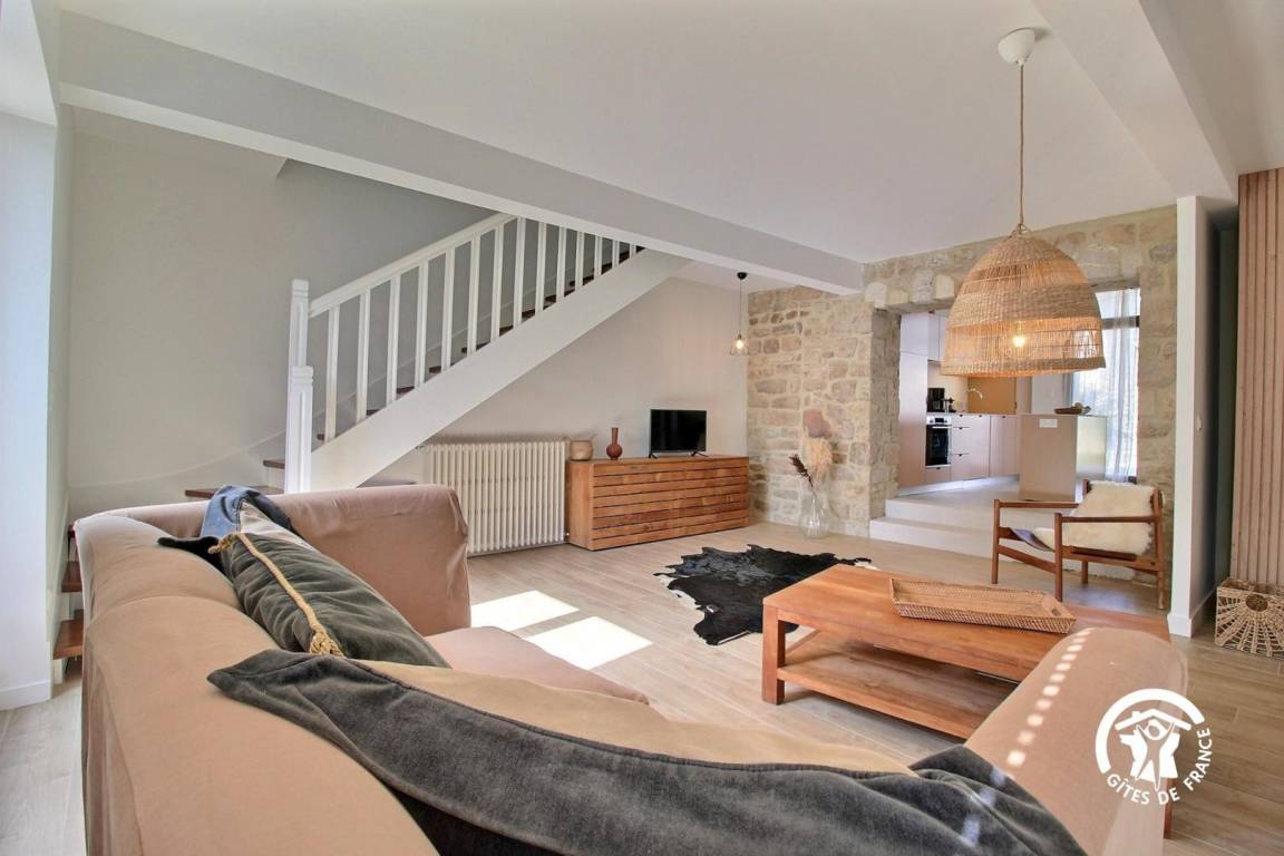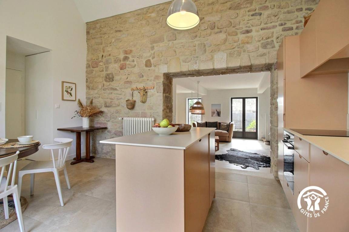 Sie wohnen in einem ehemaligen Bauernhaus, das kürzlich zu einer luxuriösen Gîte umgebaut wurde. Die hellen Farbtöne, die geschmackvolle Einrichtung und die Steinmauern schaffen eine warme und elegante Atmosphäre – ideal für einen komfortablen Urlaub.