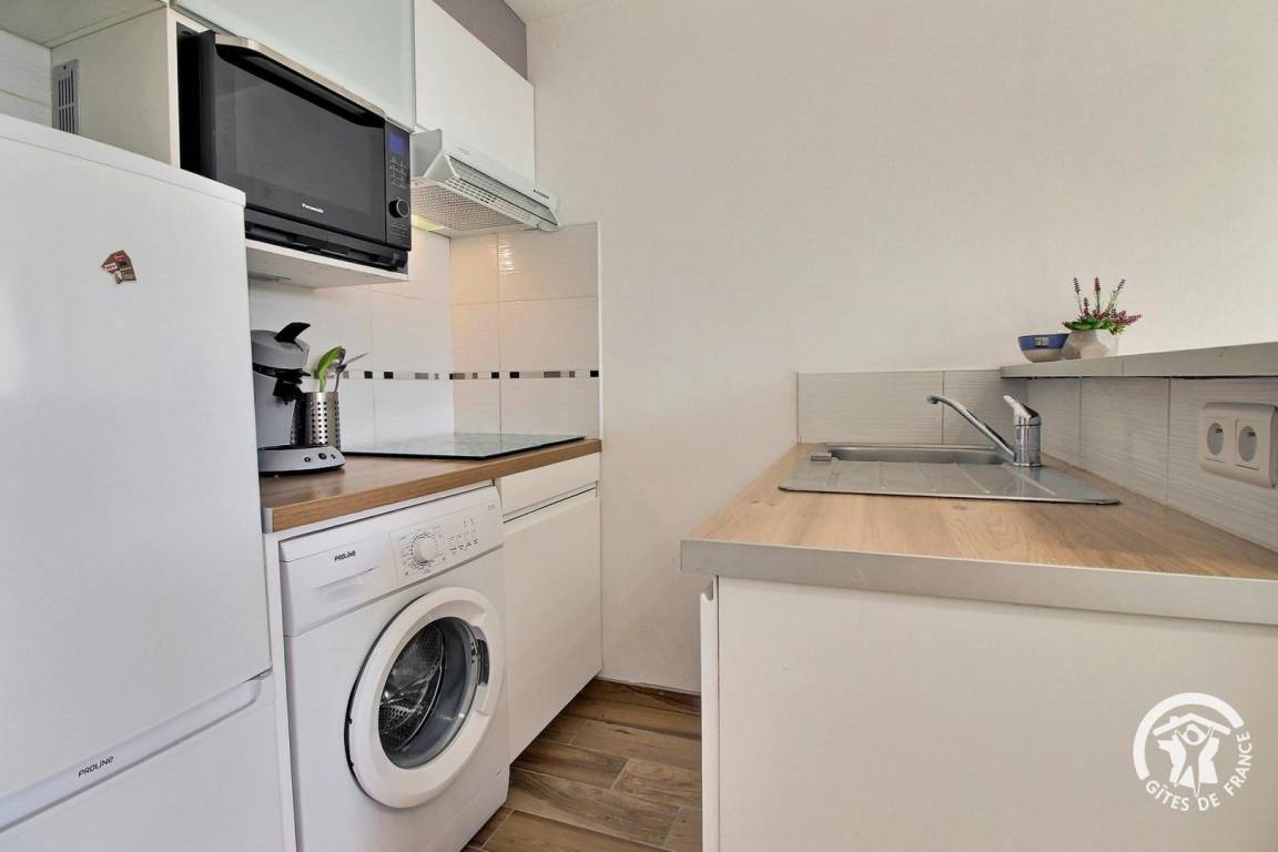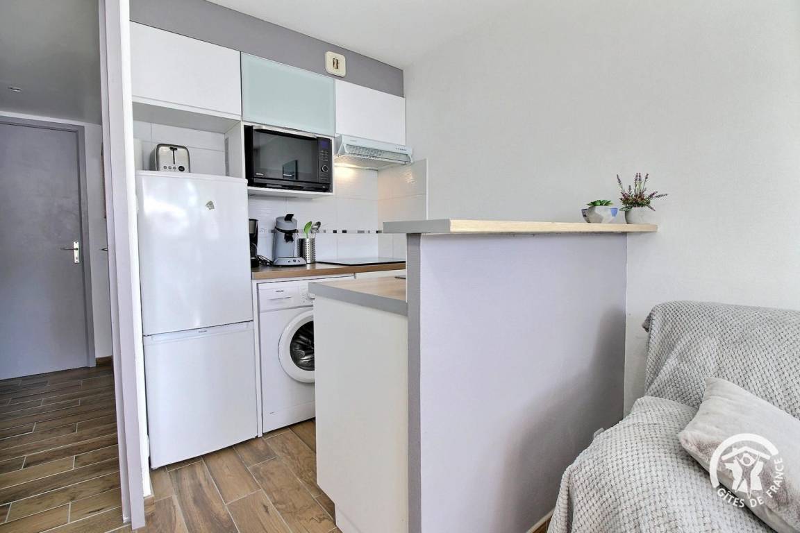 „Petite cuisine. Salle de bain petite mais douche très bien. Résidence au calme mais je ne suis pas certain que se soit bien insonorisé. Le matin j'entendais les chasses d'eau et le bruit de chaises tirées, heureusement que beaucoup de logements étaient vacants. Propreté pas au top, j'ai par exemple enlevé beaucoup de poussière ancienne sur les barreaux du sèche serviettes et nettoyé le WC et le lave linge. Plages à 5 min, restaurants à 15 mn à pied. Ville avec parkings payantsPropriétaires conciliants avec les horaires d'arrivée et de départ.“