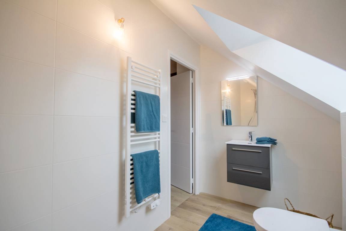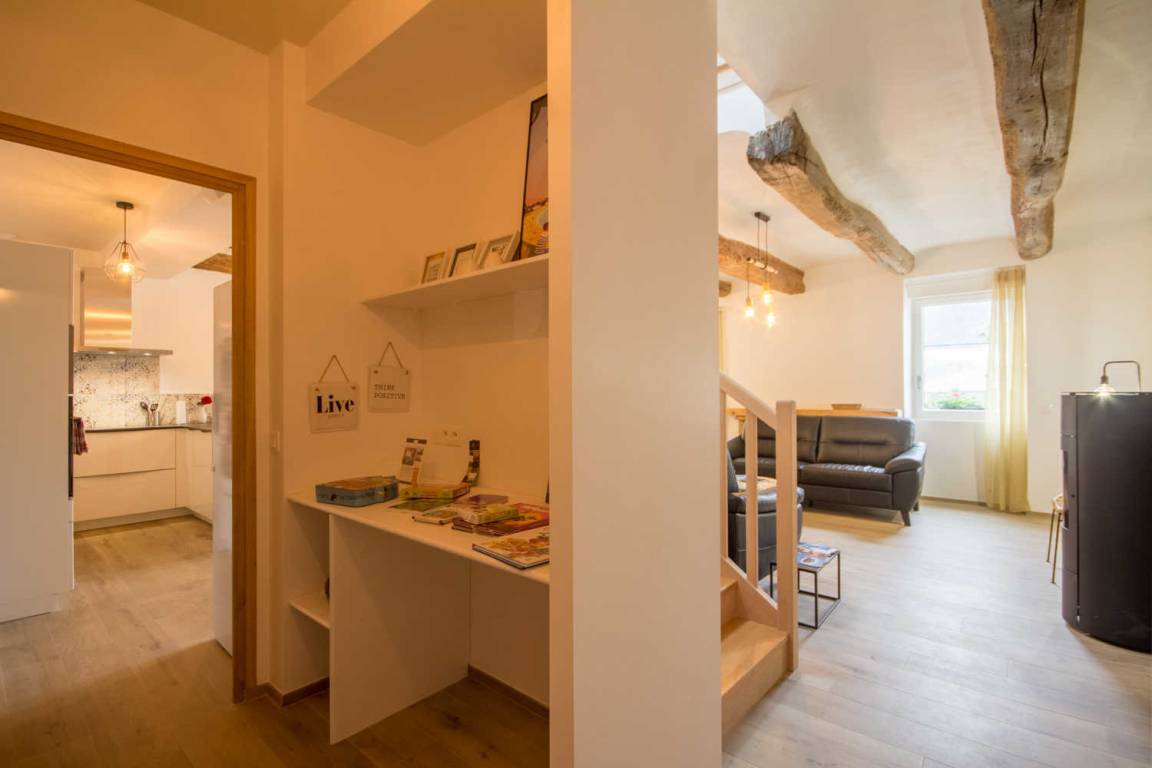 Das Erdgeschoss besteht aus einem Wohnzimmer, Wohnzimmer und offener Küche, 1 Schlafzimmer (1 Doppelbett) mit eigenem Duschbad/WC, das für Personen mit eingeschränkter Mobilität zugänglich ist, einem Keller, einem Ankleidezimmer und einer Toilette.