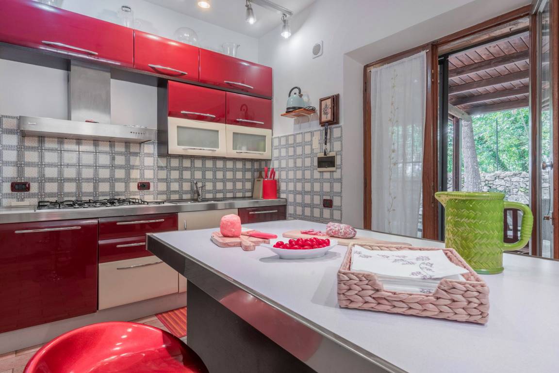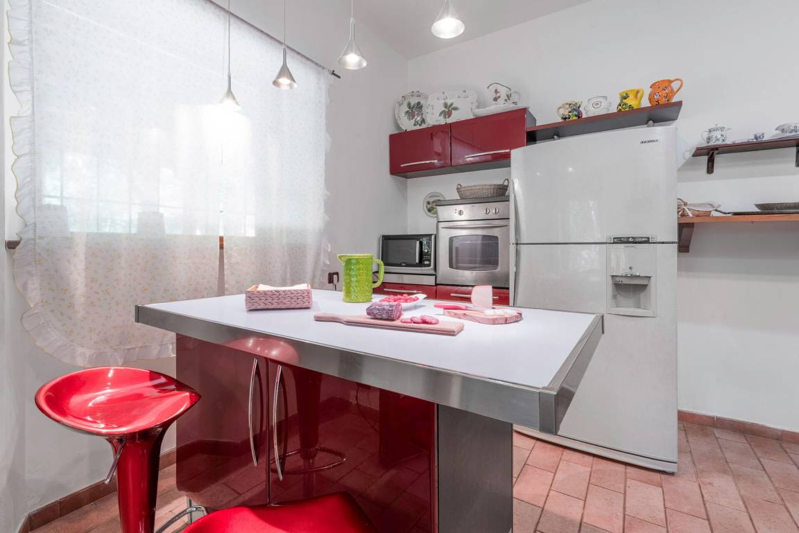 Küche: gut ausgestattete Küche, Esstisch (Personen: 6), Spülmaschine, Kühlschrank, Herd, Ofen, Italienische Kaffeemaschine, Waschmaschine, WiFi Internet, Kinderhochstuhl, Rauchmelder, CO2 Detektor, Ausgang auf den Garten.