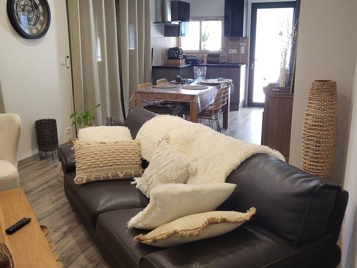 Layout : Parterre: offene Küche mit Kochherd(4 Kochplatten, elektrisch), Kaffeemaschine(pads), Backofen(elektrisch), Mikrowelle, Kühl-/Gefrierkombination , Wohn/Esszimmer mit TV, Esstisch, Sitzecke , Schlafzimmer mit Doppelbett(140 x 190 cm), TV , Badezimmer mit Dusche, Waschbecken , Hottub, Toilette, Heizung(Warmepumpe), Klimaanlage, Terrasse, Liegen, BBQ(Holzkohle)