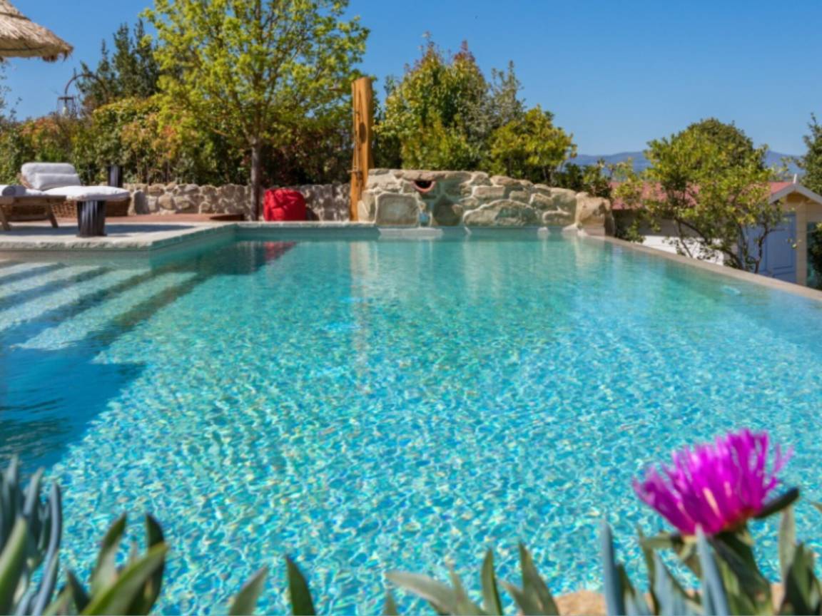 Garten (3000 m²): Schwimmbad (privat, Breite: 4m, Länge: 10m, max. Tiefe: 1.4m, min. Tiefe: 1.4m, Tiefe: 1.4m, Außen), Heißwasser-Whirlpool im Freien (Breite: 2.3m, Länge: 2.3m), Dusche, WiFi Internet, Grill, Außenbereich für das Essen im Freien, Pavillon, Gartenmöbel, 12 Sonnenliegen.