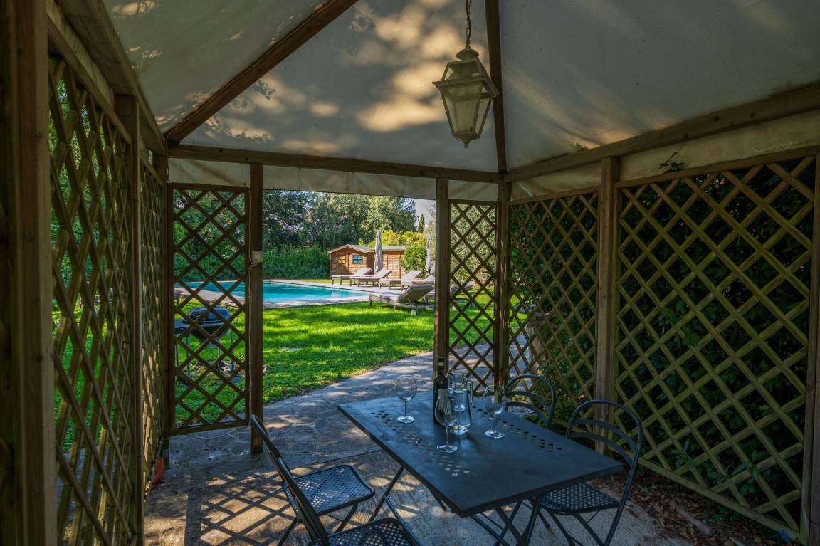 Garten: Schwimmbad (privat, Außen), Dusche, Grill, Außenbereich für das Essen im Freien, Esstisch, Pavillon, Gartenmöbel, 12 Sonnenliegen, eingezäunt, umzäuntes Grundstück.