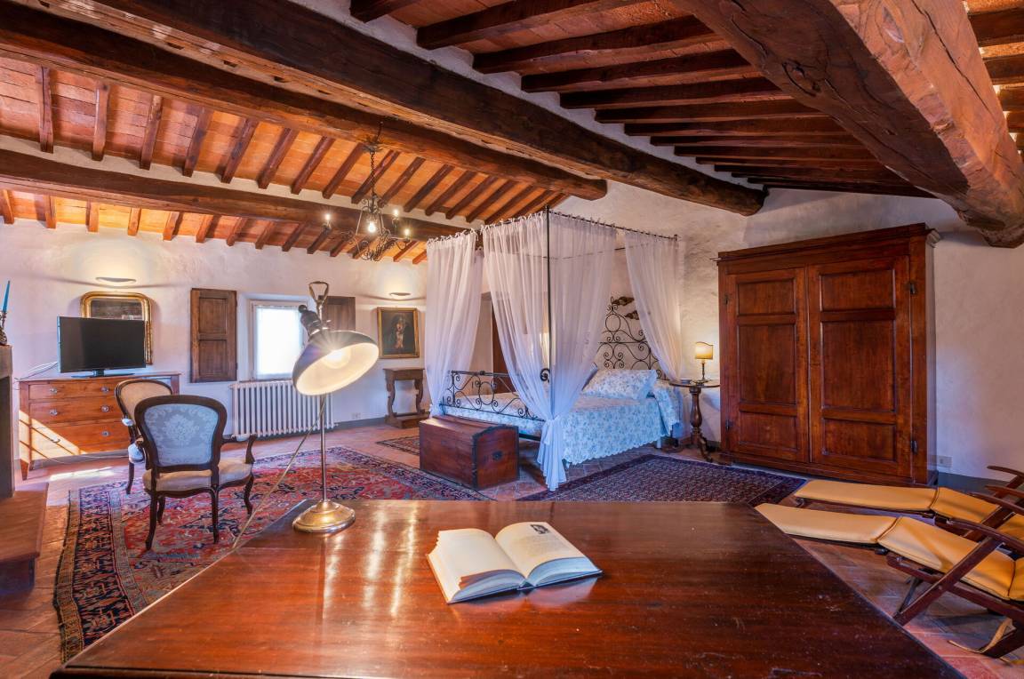 Schlafzimmer: Doppelbett, WiFi Internet, Fliegengitter, Satelliten-TV, TV, tragbarer Ventilator, zwei Sessel, Schreibtisch, Kamin.