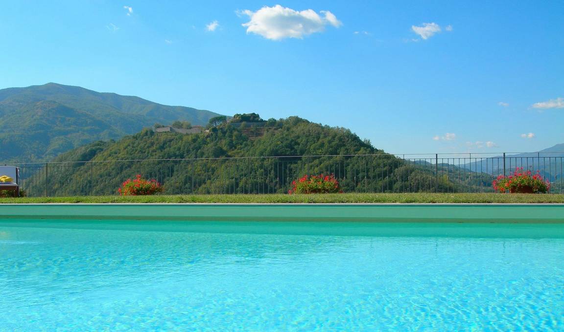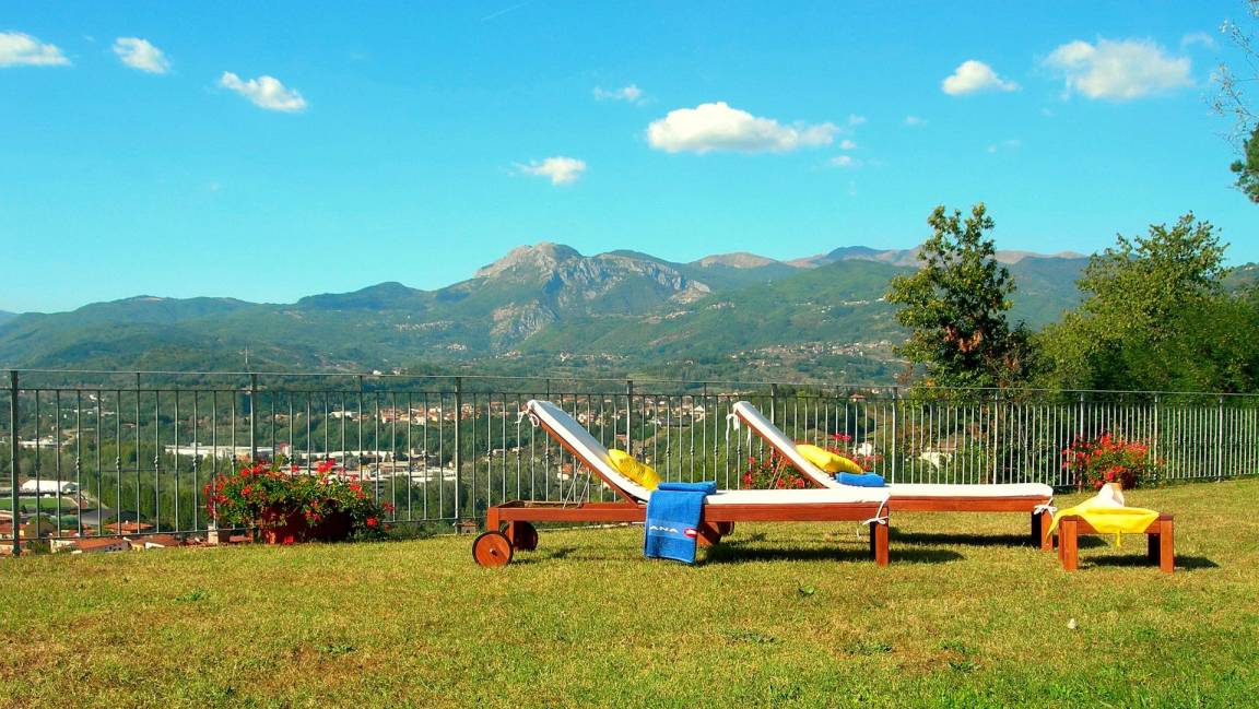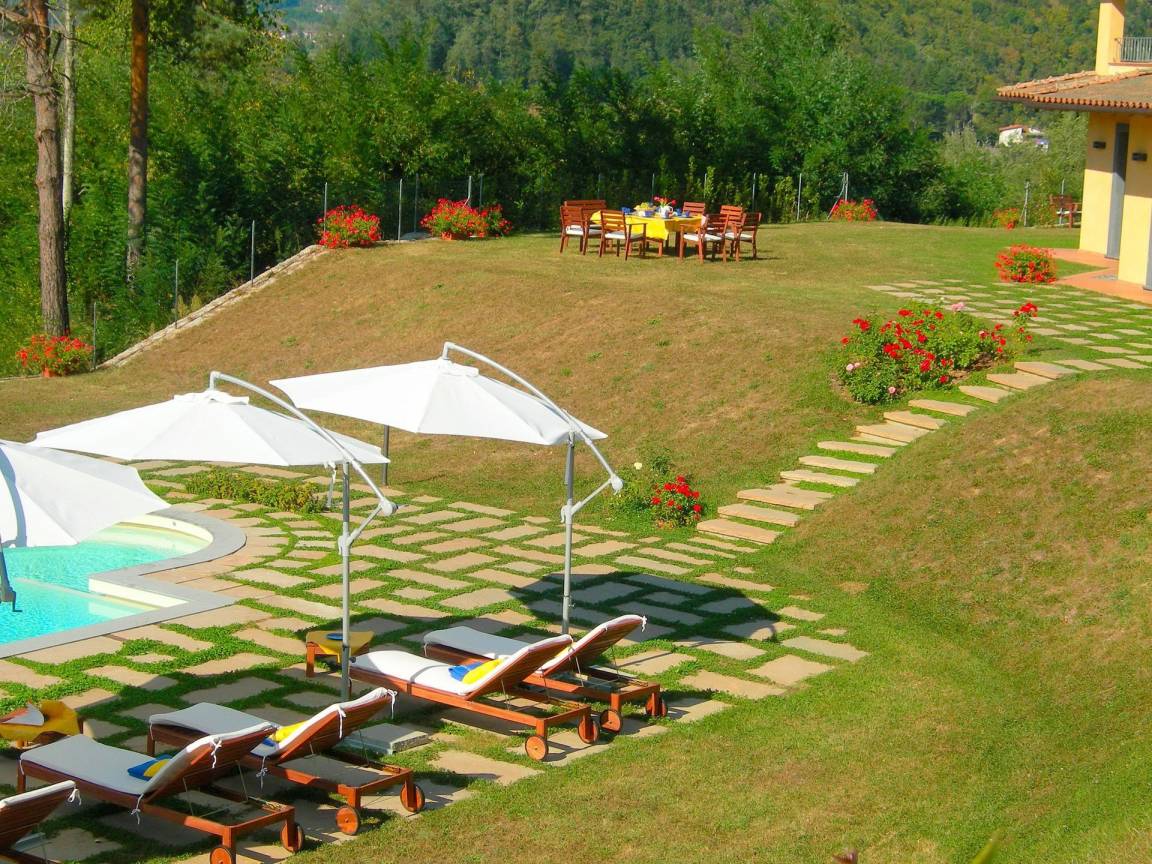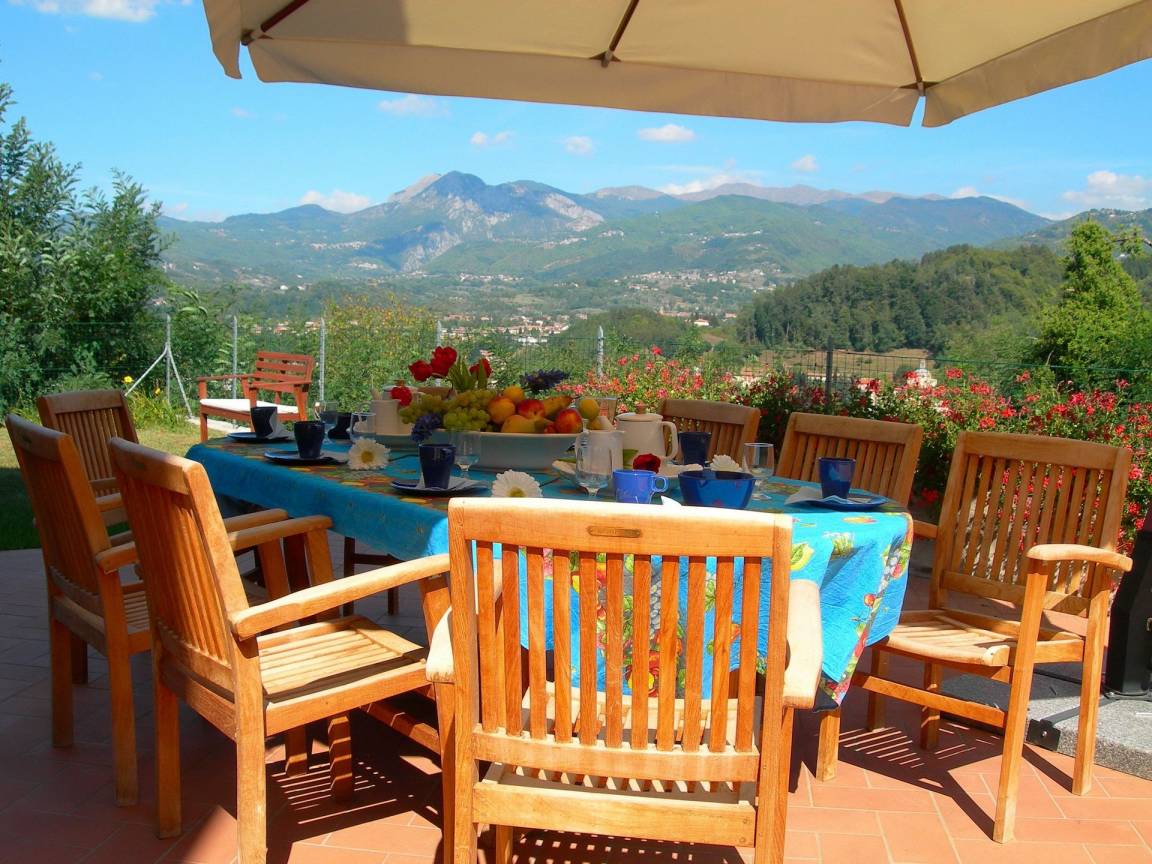 1.Stock (201 m²) zu erreichen über eine grosse, helle Treppe in toskanischem Terracotta: Doppelzimmer mit Ehebett und privatem Bad mit2 Waschbecken und Whirlpool-Badewanne und Massagedusche und Schrankzimmer, Doppelzimmer mit privatem Bad mit 2 Waschbecken und Dusche, Doppelzimmer mit Ehebett und privatem Bad mit Whirlpool-Badewanne und Massagedusche; von diesen 3 Zimmern hat man Zugang zu einer grossen Terrasse auf der Schwimmbadseite mit Blick über die ganze Garfagnana; 2 Doppelzimmer jeweils mit Ehebett und jeweils mit angrendendem Bad mit Dusche.