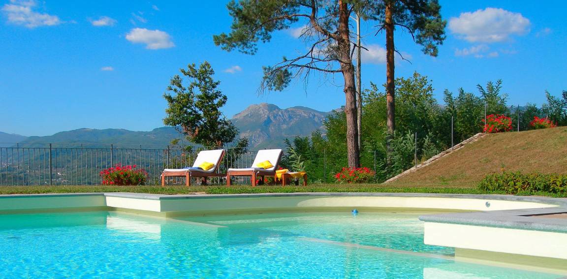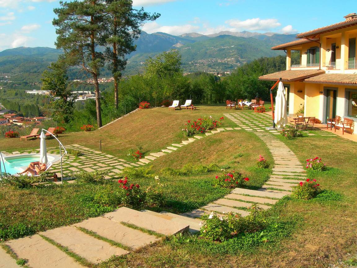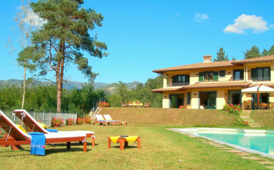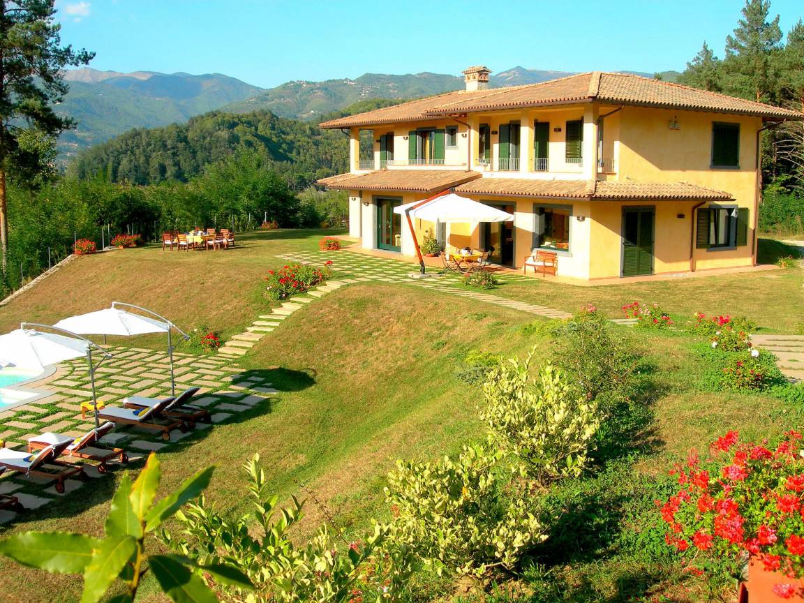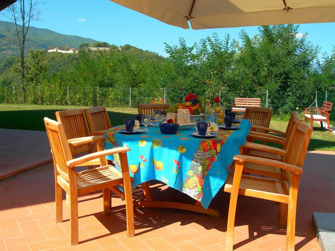 1.Stock (201 m²) zu erreichen über eine grosse, helle Treppe in toskanischem Terracotta: Doppelzimmer mit Ehebett und privatem Bad mit2 Waschbecken und Whirlpool-Badewanne und Massagedusche und Schrankzimmer, Doppelzimmer mit privatem Bad mit 2 Waschbecken und Dusche, Doppelzimmer mit Ehebett und privatem Bad mit Whirlpool-Badewanne und Massagedusche; von diesen 3 Zimmern hat man Zugang zu einer grossen Terrasse auf der Schwimmbadseite mit Blick über die ganze Garfagnana; 2 Doppelzimmer jeweils mit Ehebett und jeweils mit angrendendem Bad mit Dusche.