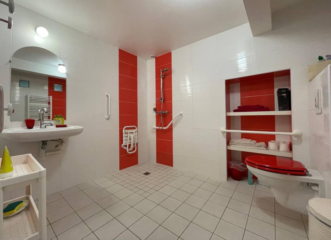 - 1 behindertengerechtes Schlafzimmer (1 Bett 160) und behindertengerechtes Badezimmer (Dusche, Waschbecken, Toilette)