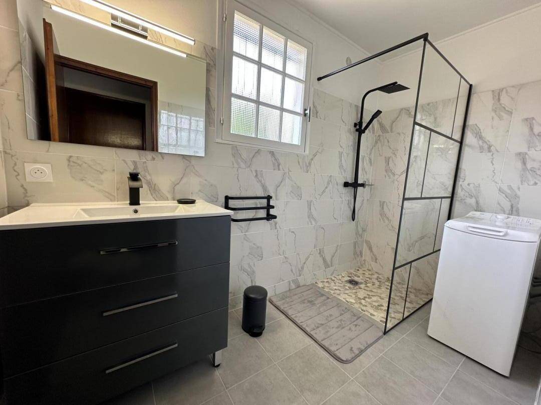 ein Badezimmer mit ebenerdiger Dusche und Waschmaschine sowie