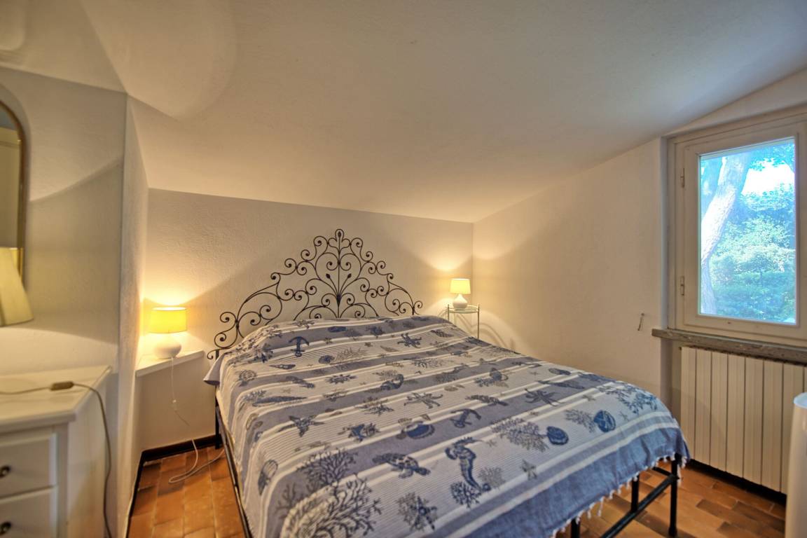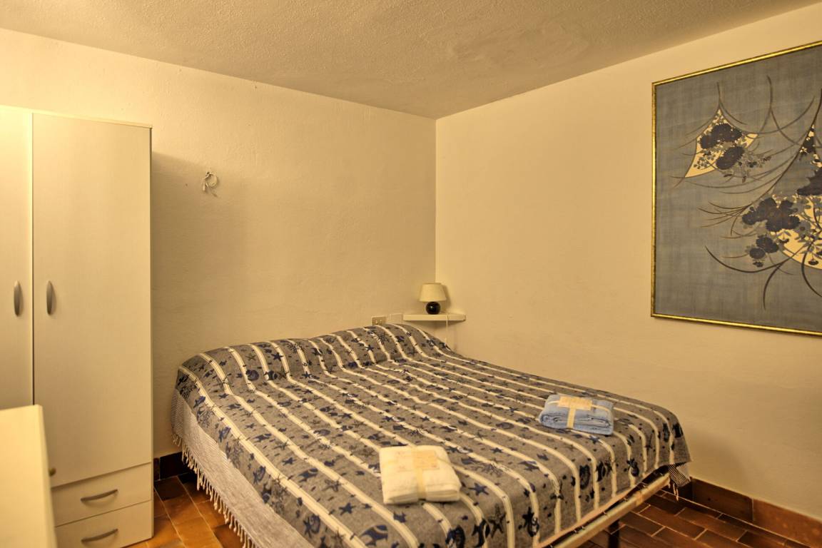 4 Stufen tiefer: Zimmer (ohne Fenster und Blick ins Wohnzimmer) mit französischem Bett.