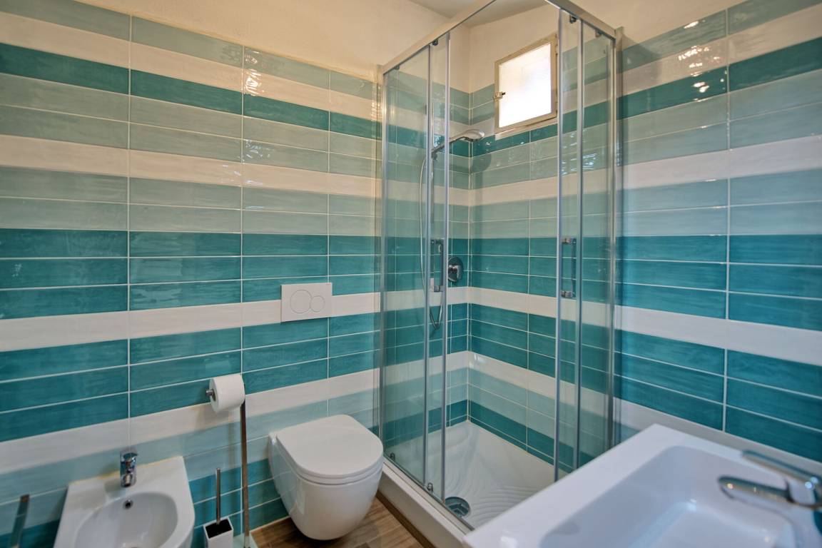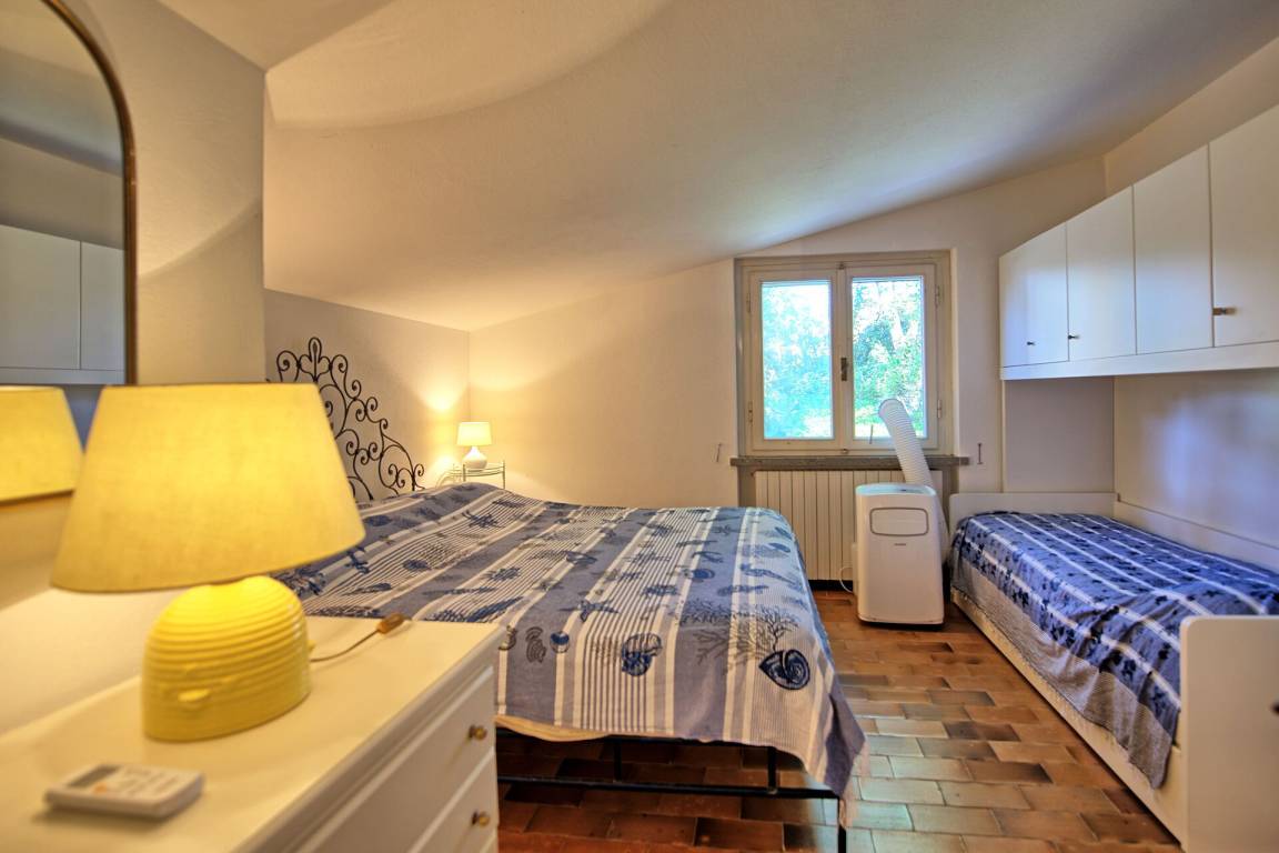 Erster Stock: Schlafzimmer mit Doppelbett und Einzelbett (mobile Klimaanlage), Bad mit Dusche.