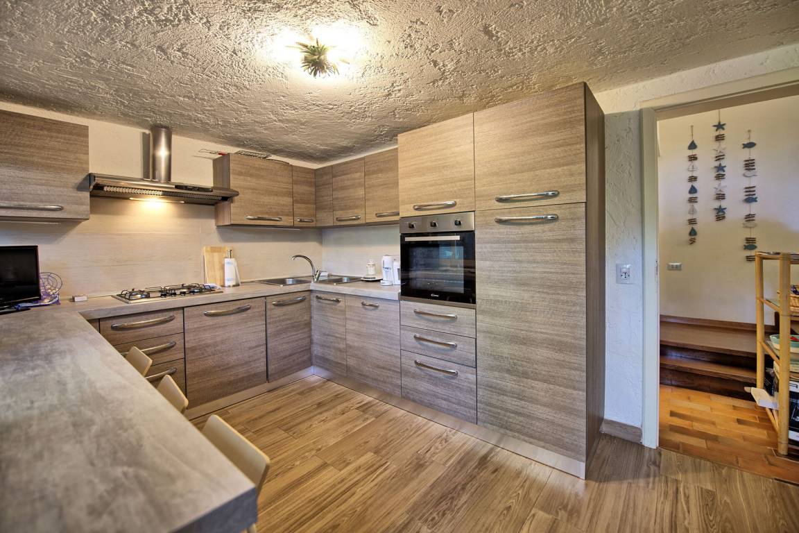 3 Stufen tiefer: Küche (Herd, Kühlschrank, Backofen, Geschirrspüler) mit Zugang zum Garten (3 Stufen höher).