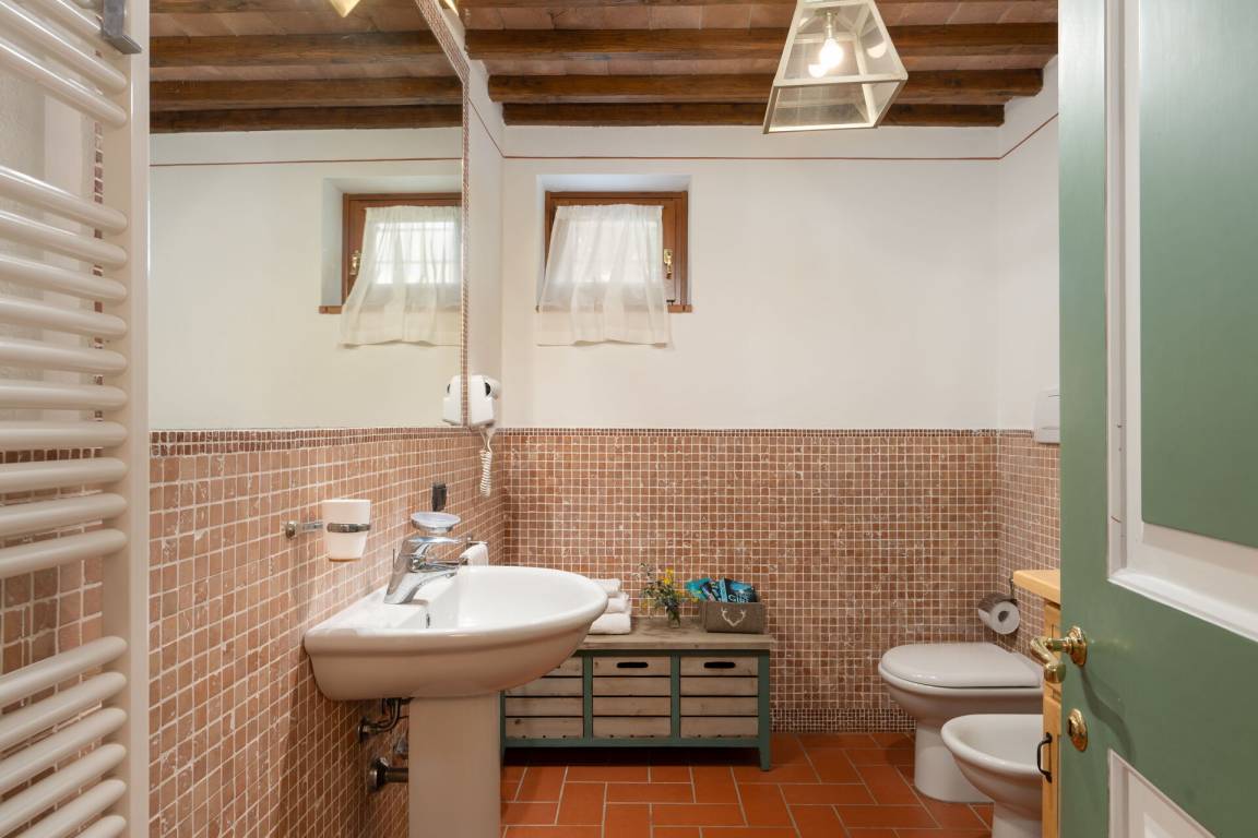 Badezimmer: Waschbecken, WC, Bidet, Dusche, Fön.
