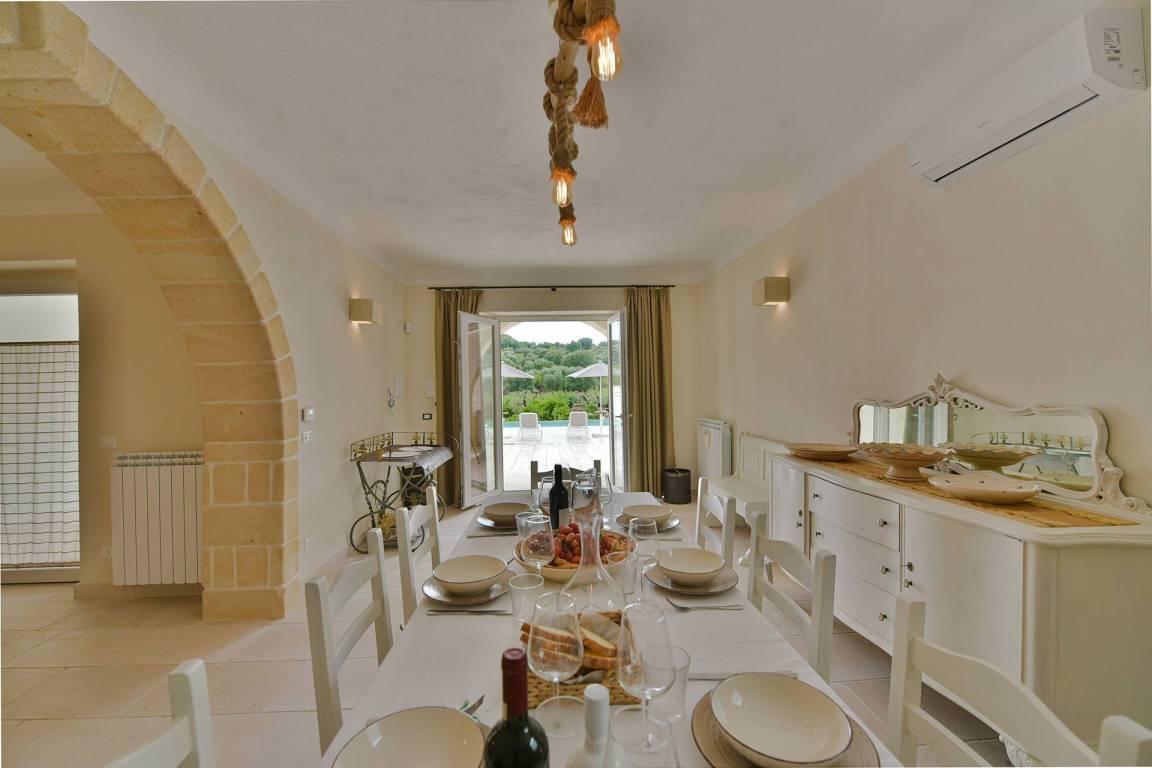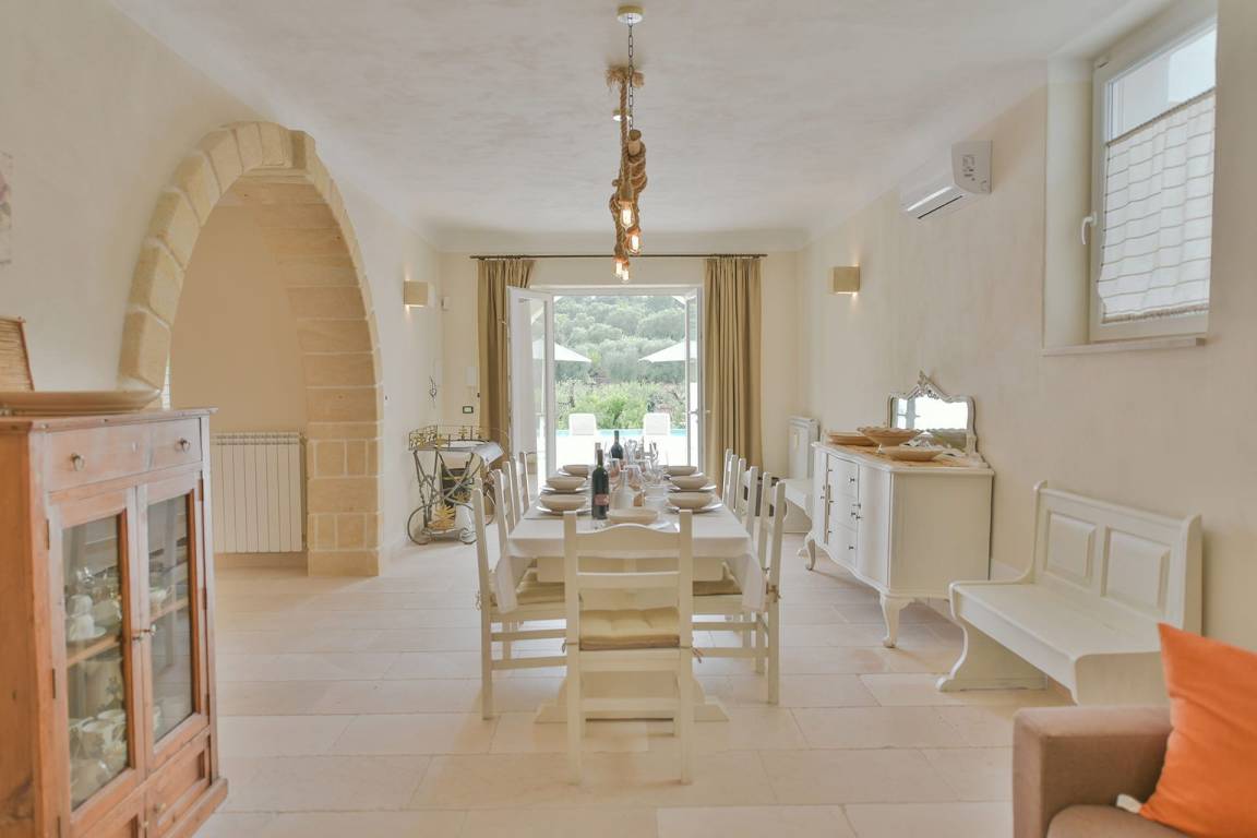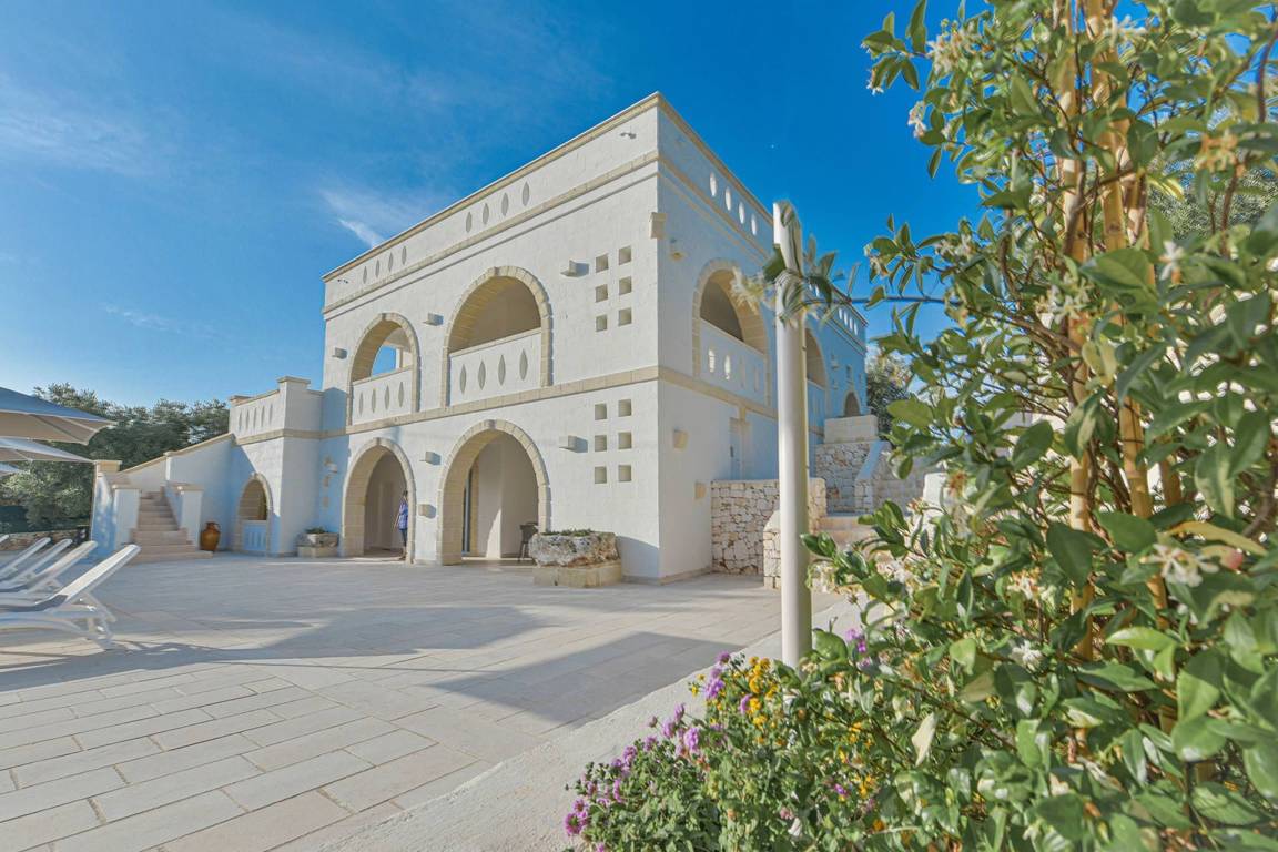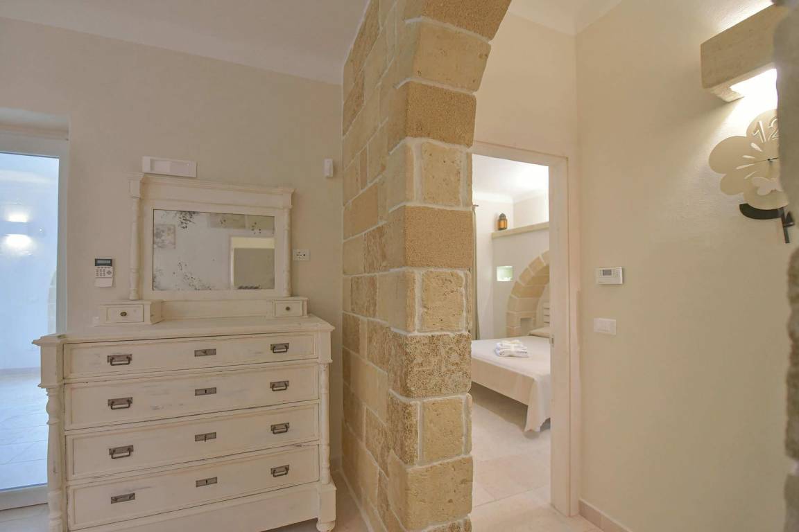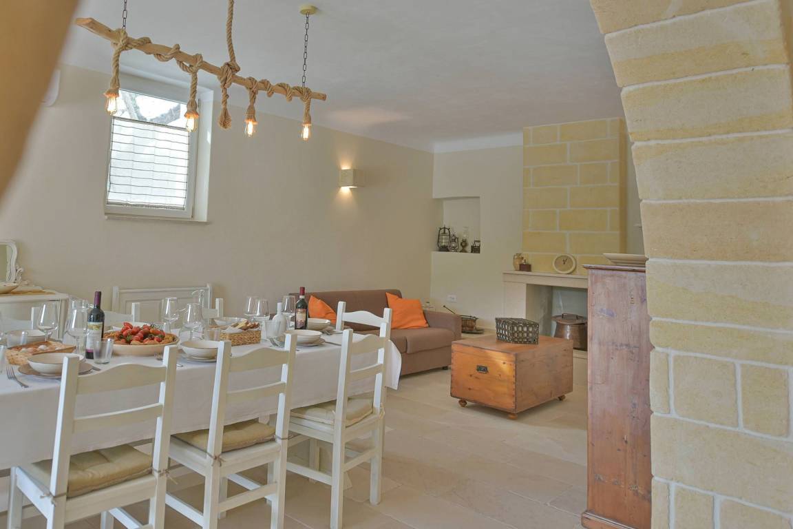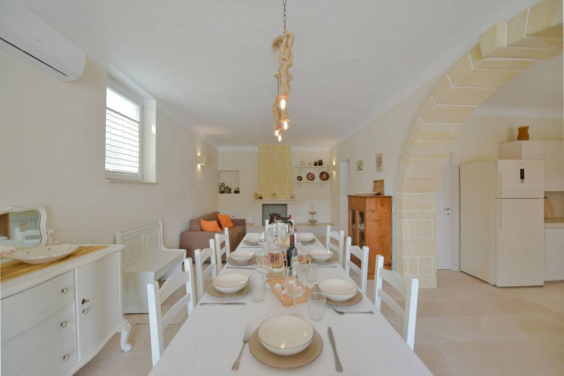 Die Masseria erstreckt sich über 2 Geschosse, bietet Platz für maximal 8 Gäste und verfügt über 4 Schlafzimmer und 3 Bäder. Das Erdgeschoss öffnet sich zu einem großzügigen und hellen Wohnbereich mit Blick auf den Pool, der mit komfortablen Sofas einschließlich eines umwandelbaren Doppelschlafsofa ausgestattet ist. Der Wohnbereich verfügt über einen Kamin mit offenem Herd und eine vollständig ausgestattete Küche mit Nespresso-Kaffeemaschine und weiteren Geräten. Eine externe Treppe verbindet das Erdgeschoss mit dem ersten Obergeschoss, wo sich die 3 Schlafzimmer befinden. Zwei dieser Zimmer sind mit Doppelbetten ausgestattet, das dritte mit 2 Einzelbetten, die auf Anfrage zusammengefügt werden können. Jedes der 3 Schlafzimmer verfügt über ein eigenes en-suite Bad mit Dusche.