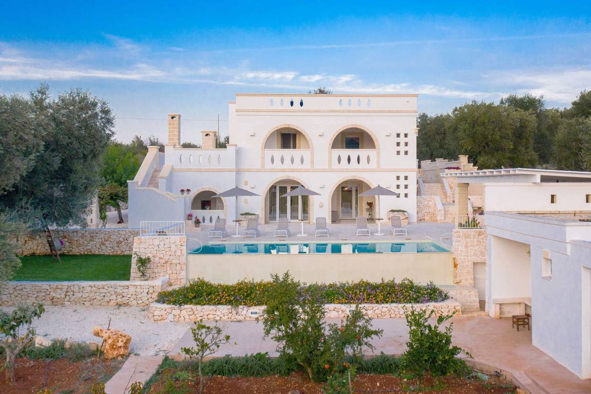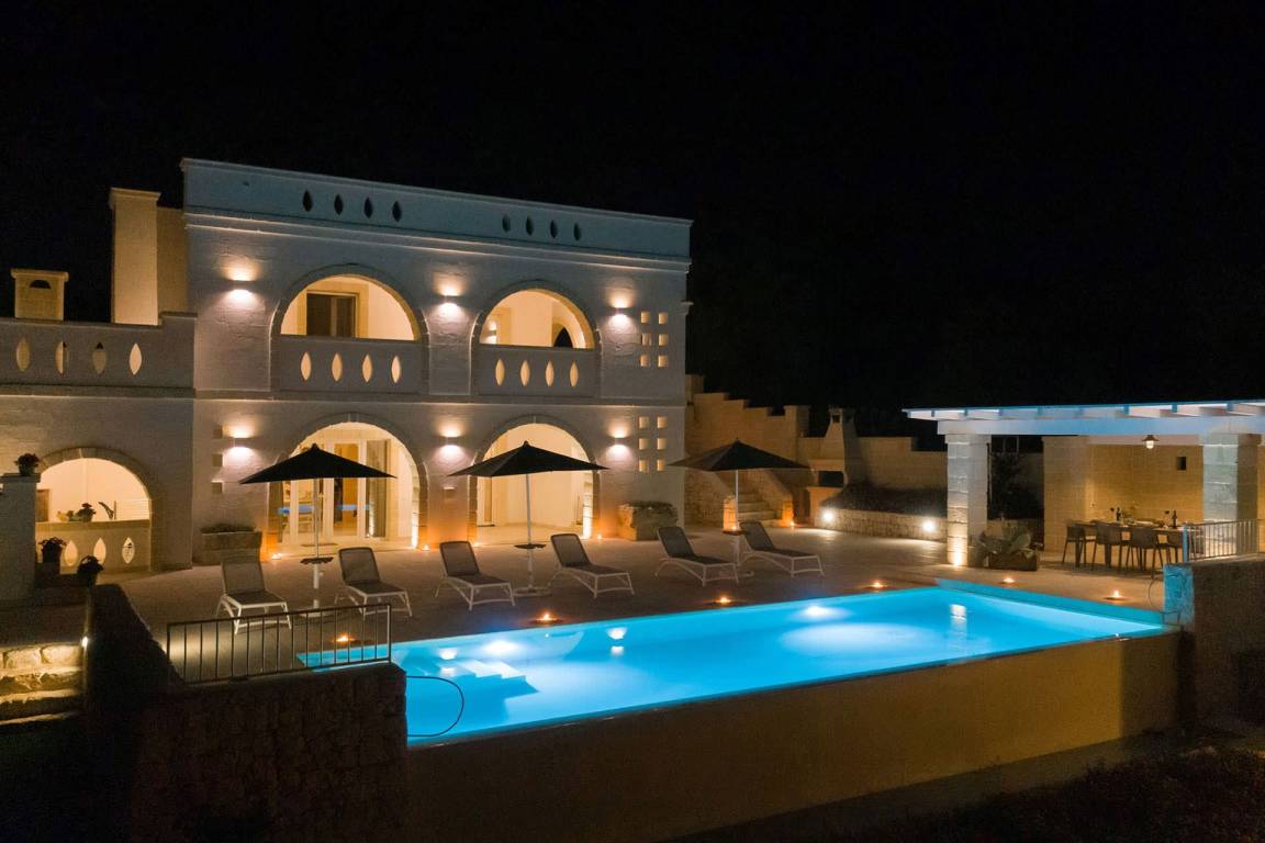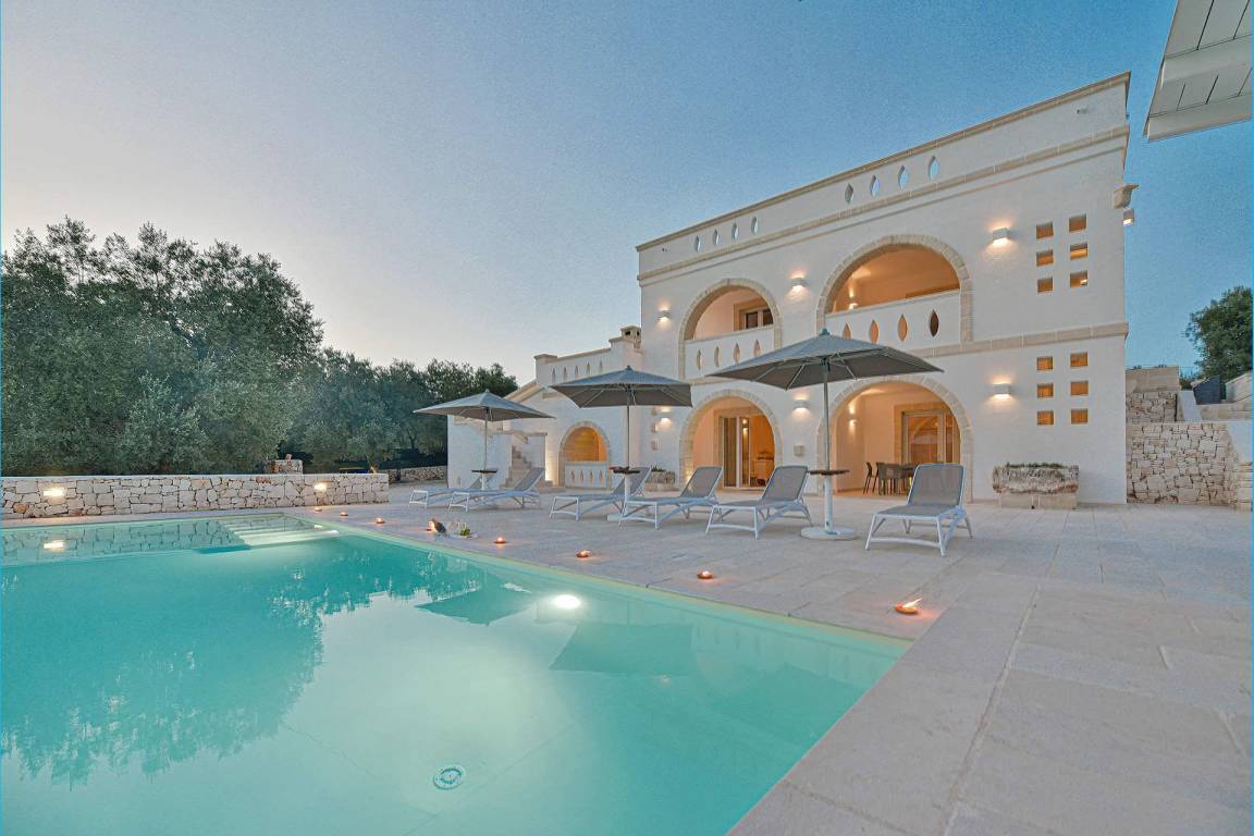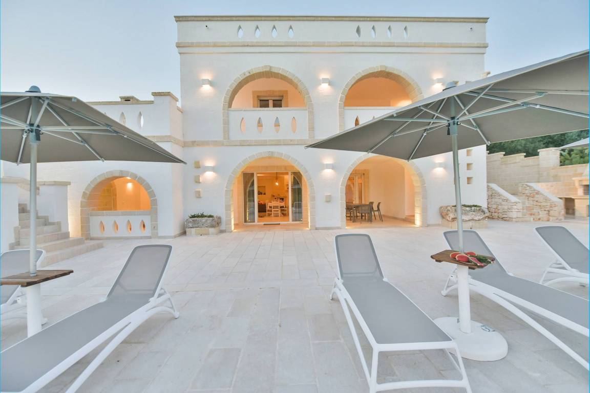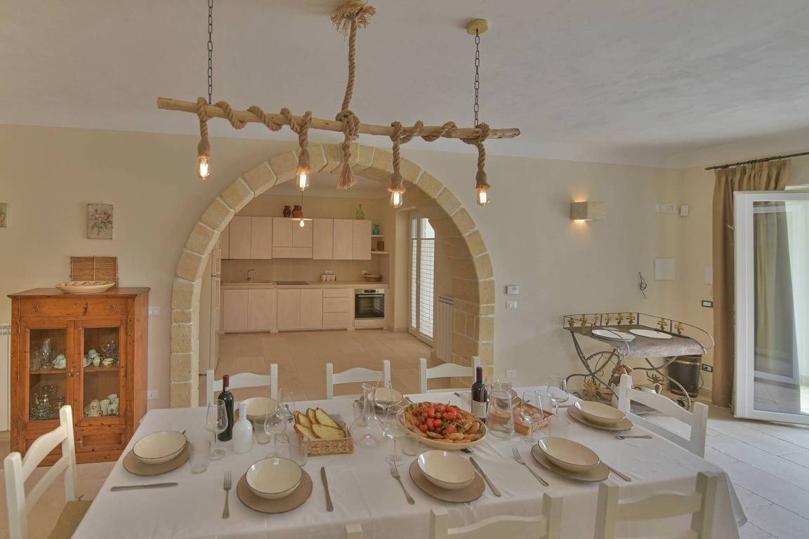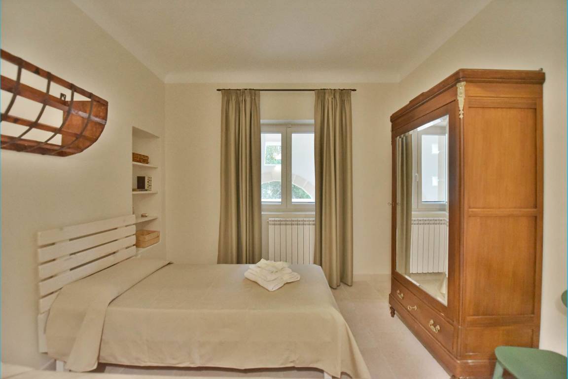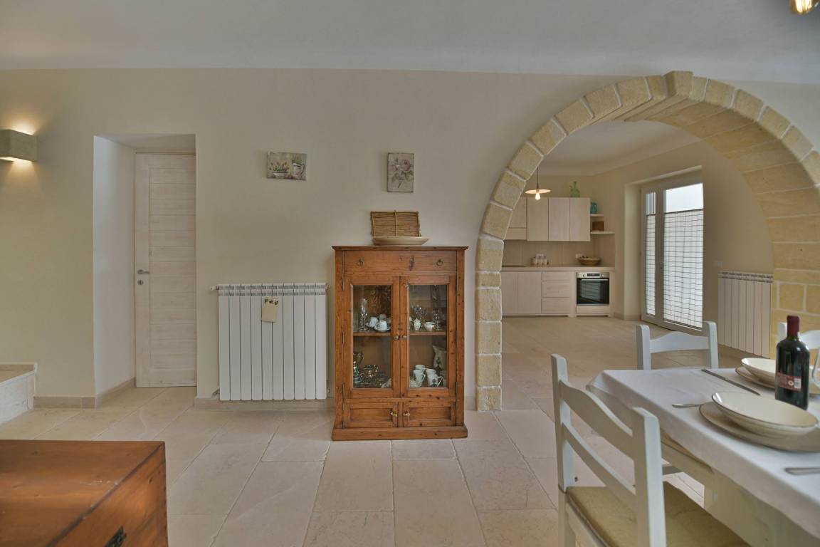 Die Masseria erstreckt sich über 2 Geschosse, bietet Platz für maximal 8 Gäste und verfügt über 4 Schlafzimmer und 3 Bäder. Das Erdgeschoss öffnet sich zu einem großzügigen und hellen Wohnbereich mit Blick auf den Pool, der mit komfortablen Sofas einschließlich eines umwandelbaren Doppelschlafsofa ausgestattet ist. Der Wohnbereich verfügt über einen Kamin mit offenem Herd und eine vollständig ausgestattete Küche mit Nespresso-Kaffeemaschine und weiteren Geräten. Eine externe Treppe verbindet das Erdgeschoss mit dem ersten Obergeschoss, wo sich die 3 Schlafzimmer befinden. Zwei dieser Zimmer sind mit Doppelbetten ausgestattet, das dritte mit 2 Einzelbetten, die auf Anfrage zusammengefügt werden können. Jedes der 3 Schlafzimmer verfügt über ein eigenes en-suite Bad mit Dusche.