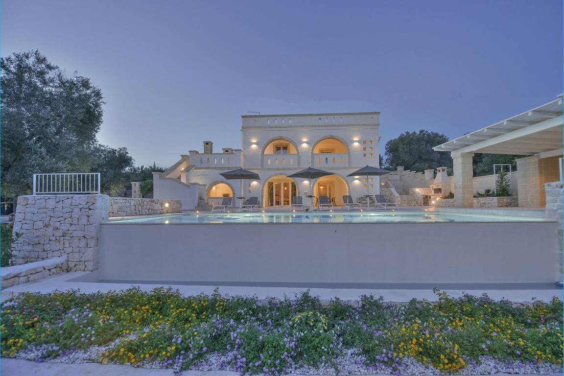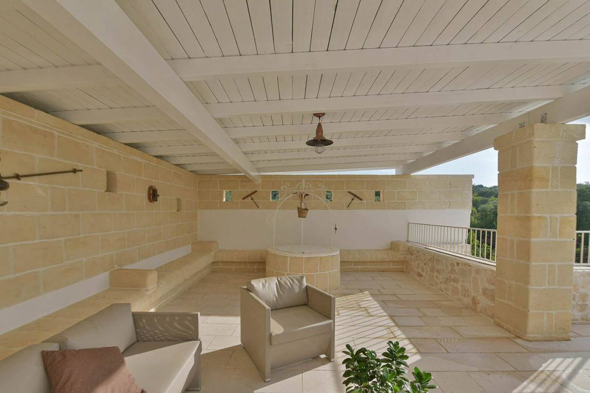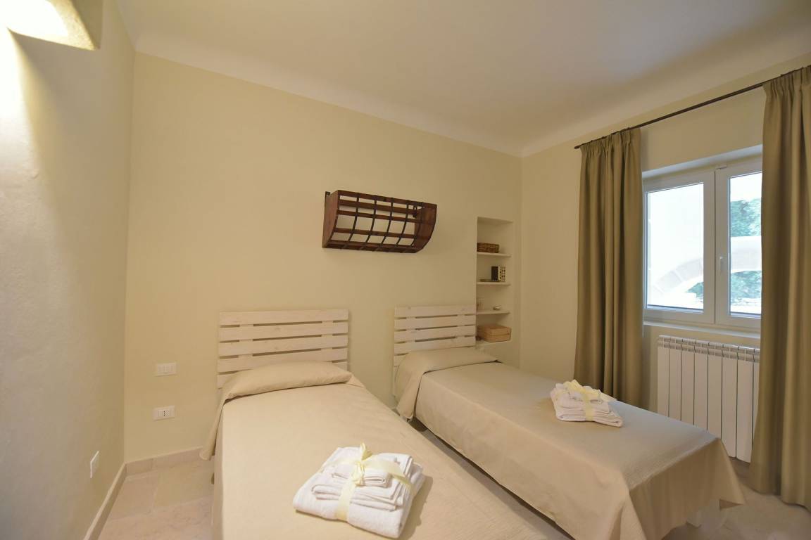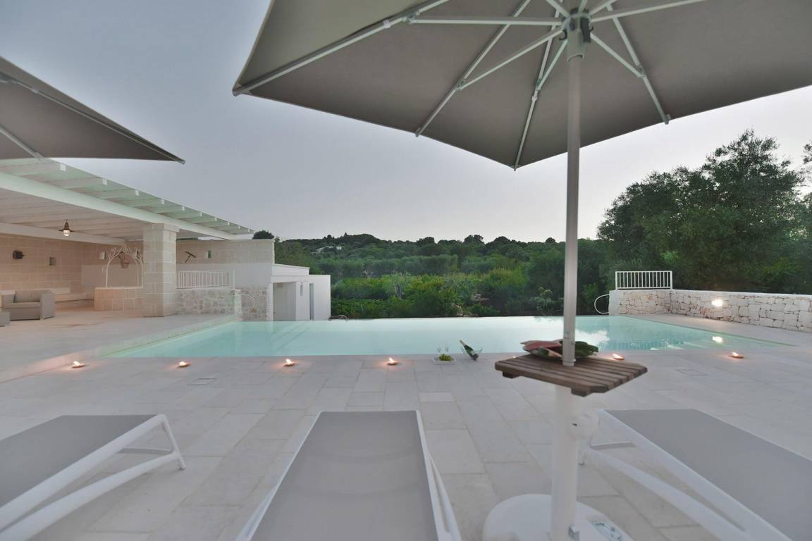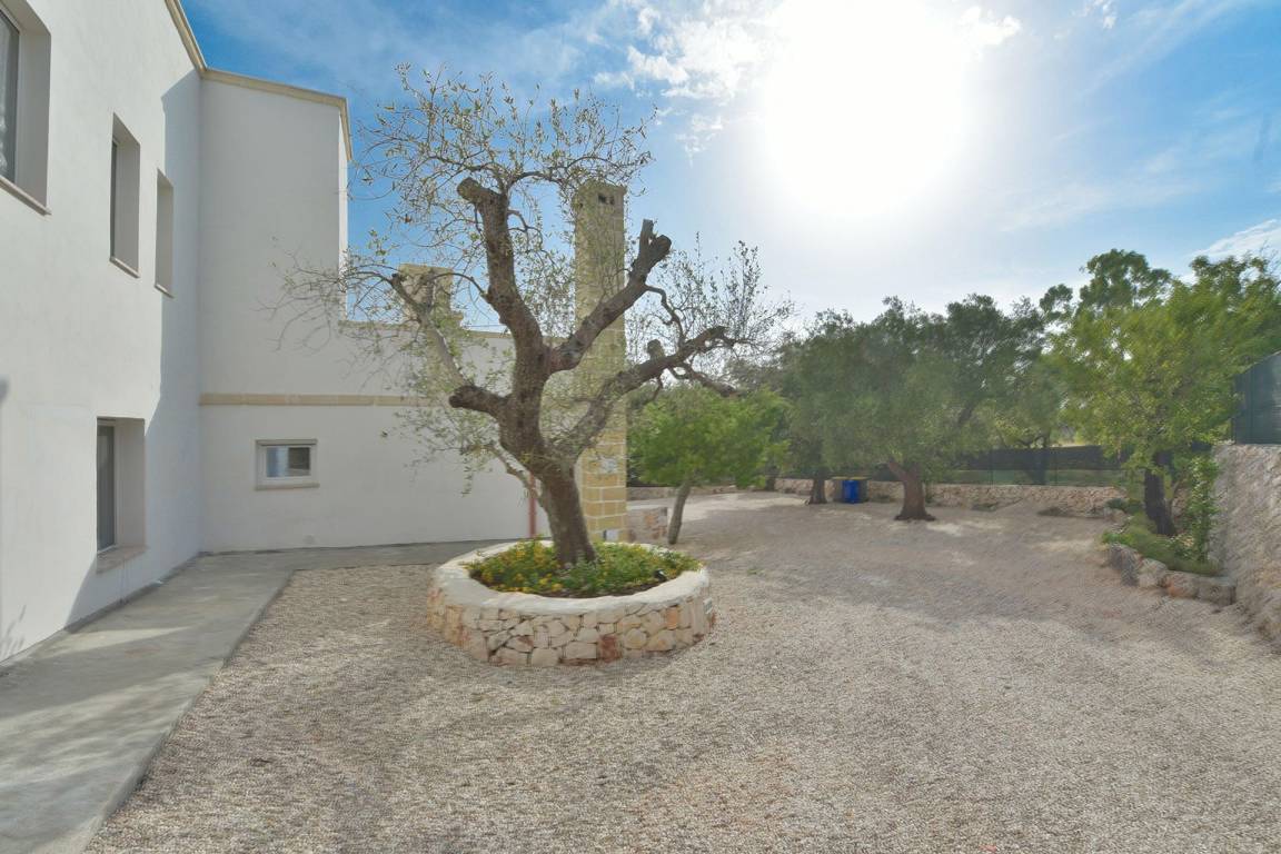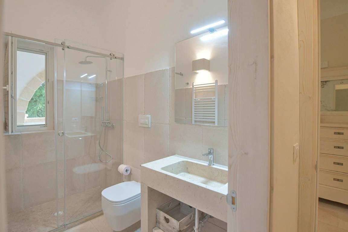 Die Masseria erstreckt sich über 2 Geschosse, bietet Platz für maximal 8 Gäste und verfügt über 4 Schlafzimmer und 3 Bäder. Das Erdgeschoss öffnet sich zu einem großzügigen und hellen Wohnbereich mit Blick auf den Pool, der mit komfortablen Sofas einschließlich eines umwandelbaren Doppelschlafsofa ausgestattet ist. Der Wohnbereich verfügt über einen Kamin mit offenem Herd und eine vollständig ausgestattete Küche mit Nespresso-Kaffeemaschine und weiteren Geräten. Eine externe Treppe verbindet das Erdgeschoss mit dem ersten Obergeschoss, wo sich die 3 Schlafzimmer befinden. Zwei dieser Zimmer sind mit Doppelbetten ausgestattet, das dritte mit 2 Einzelbetten, die auf Anfrage zusammengefügt werden können. Jedes der 3 Schlafzimmer verfügt über ein eigenes en-suite Bad mit Dusche.