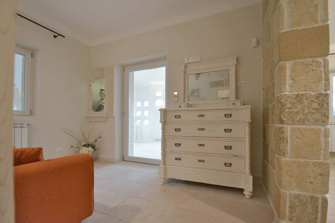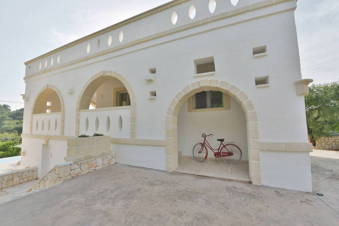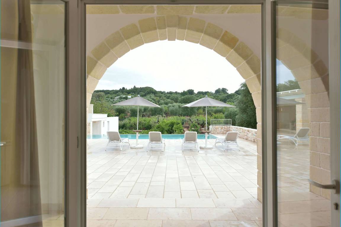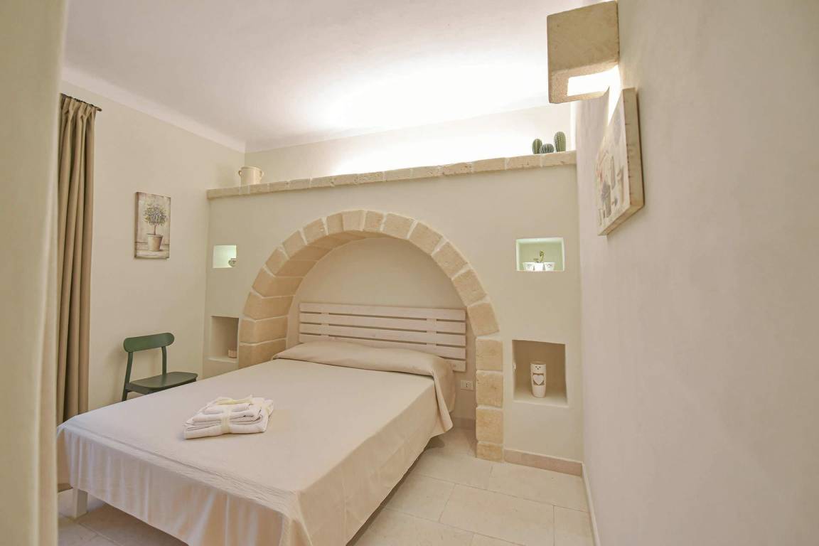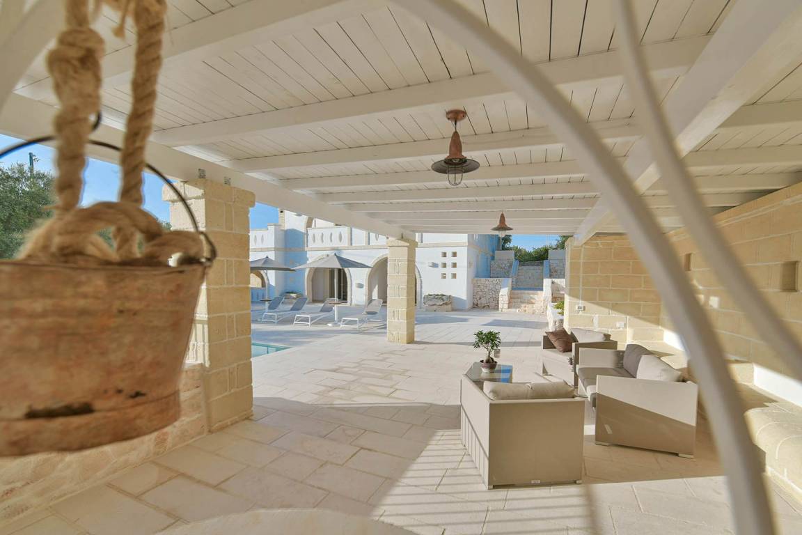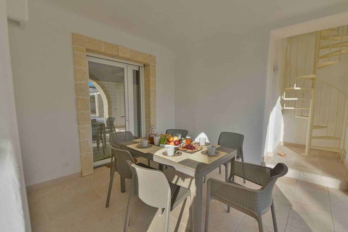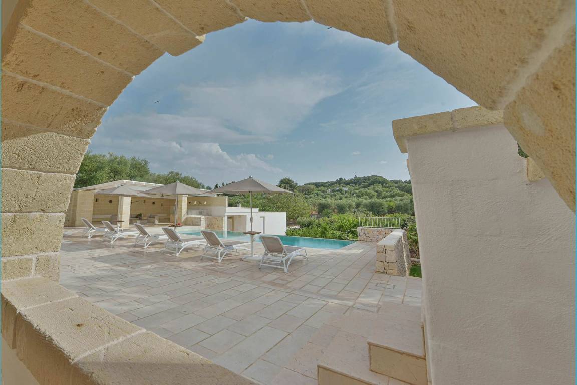 Die Masseria erstreckt sich über 2 Geschosse, bietet Platz für maximal 8 Gäste und verfügt über 4 Schlafzimmer und 3 Bäder. Das Erdgeschoss öffnet sich zu einem großzügigen und hellen Wohnbereich mit Blick auf den Pool, der mit komfortablen Sofas einschließlich eines umwandelbaren Doppelschlafsofa ausgestattet ist. Der Wohnbereich verfügt über einen Kamin mit offenem Herd und eine vollständig ausgestattete Küche mit Nespresso-Kaffeemaschine und weiteren Geräten. Eine externe Treppe verbindet das Erdgeschoss mit dem ersten Obergeschoss, wo sich die 3 Schlafzimmer befinden. Zwei dieser Zimmer sind mit Doppelbetten ausgestattet, das dritte mit 2 Einzelbetten, die auf Anfrage zusammengefügt werden können. Jedes der 3 Schlafzimmer verfügt über ein eigenes en-suite Bad mit Dusche.