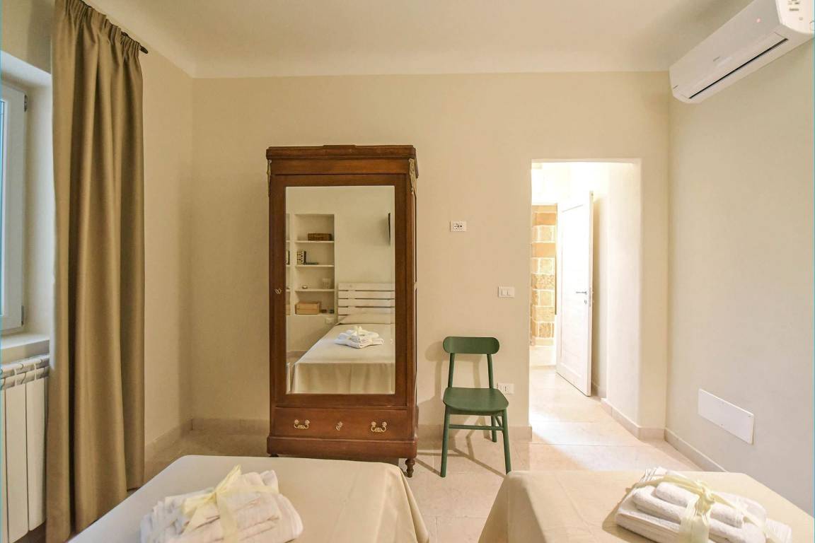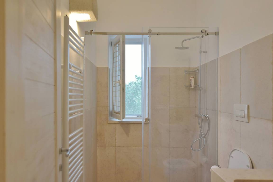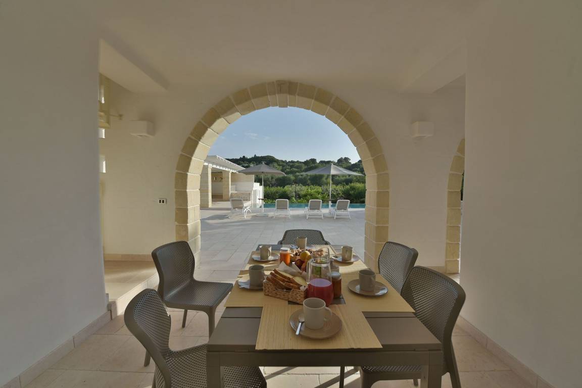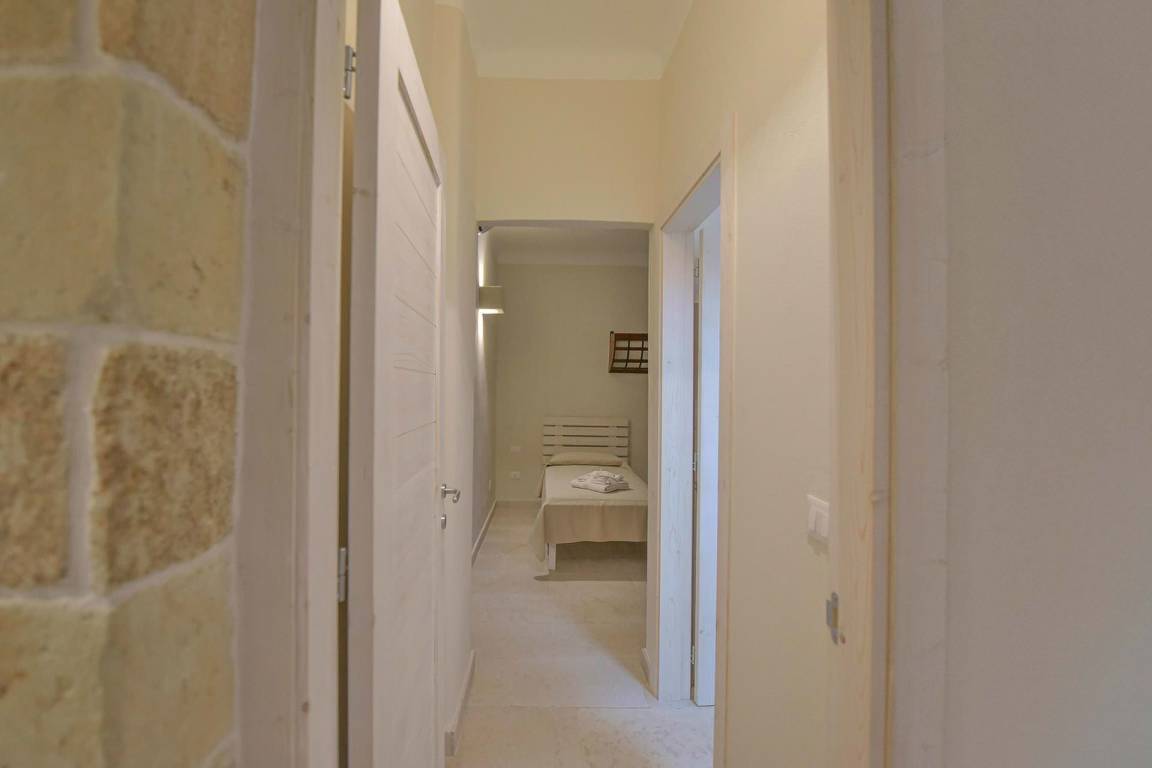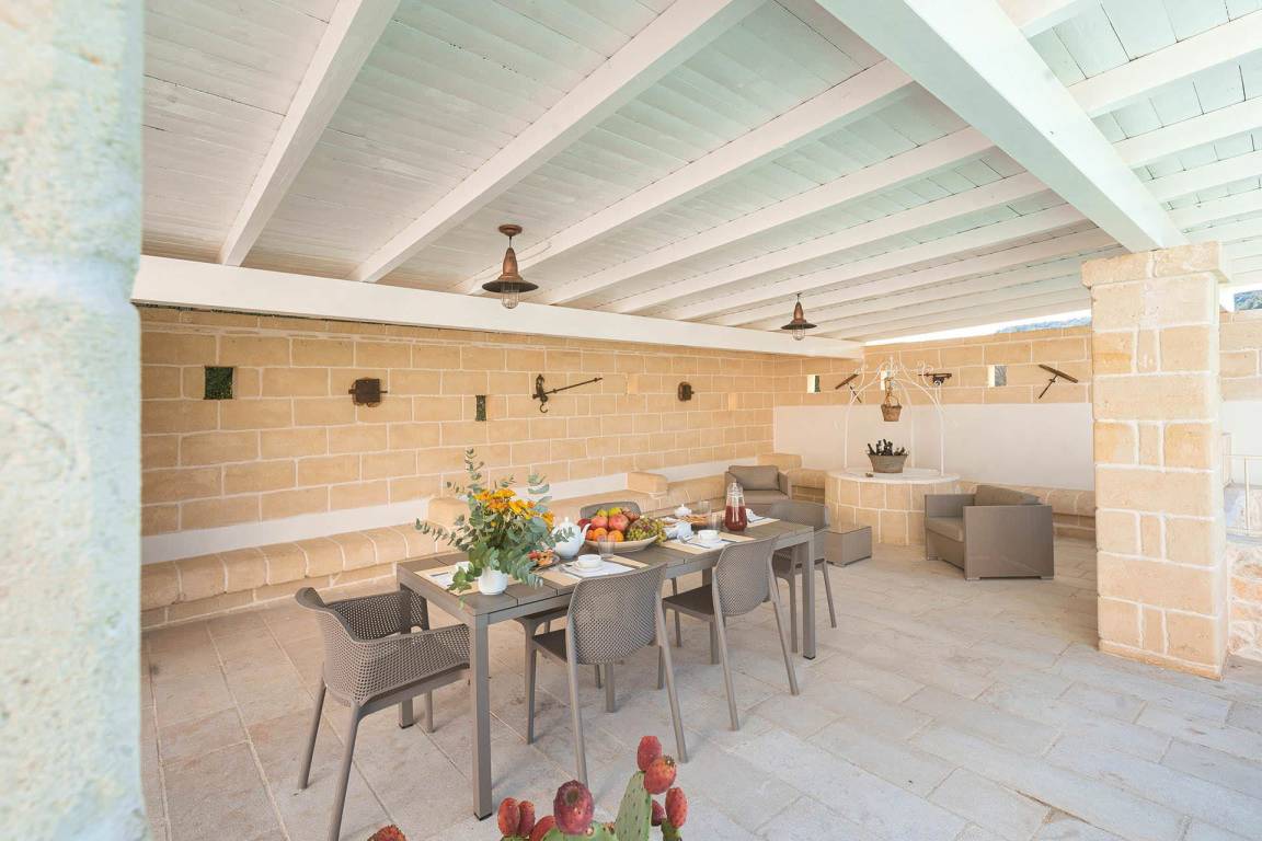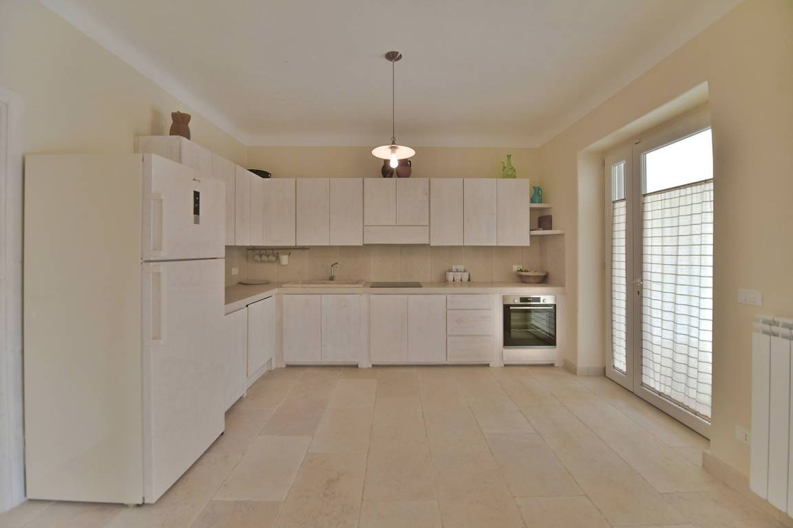 Die Masseria erstreckt sich über 2 Geschosse, bietet Platz für maximal 8 Gäste und verfügt über 4 Schlafzimmer und 3 Bäder. Das Erdgeschoss öffnet sich zu einem großzügigen und hellen Wohnbereich mit Blick auf den Pool, der mit komfortablen Sofas einschließlich eines umwandelbaren Doppelschlafsofa ausgestattet ist. Der Wohnbereich verfügt über einen Kamin mit offenem Herd und eine vollständig ausgestattete Küche mit Nespresso-Kaffeemaschine und weiteren Geräten. Eine externe Treppe verbindet das Erdgeschoss mit dem ersten Obergeschoss, wo sich die 3 Schlafzimmer befinden. Zwei dieser Zimmer sind mit Doppelbetten ausgestattet, das dritte mit 2 Einzelbetten, die auf Anfrage zusammengefügt werden können. Jedes der 3 Schlafzimmer verfügt über ein eigenes en-suite Bad mit Dusche.