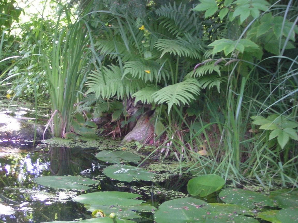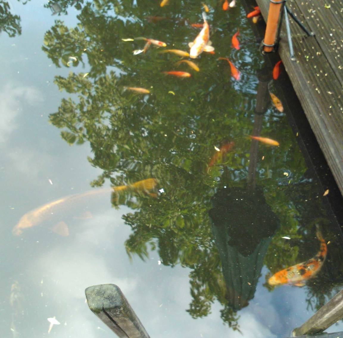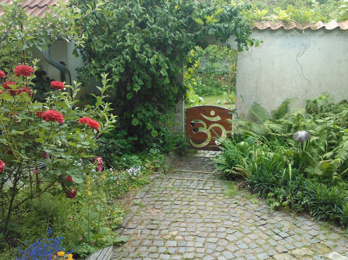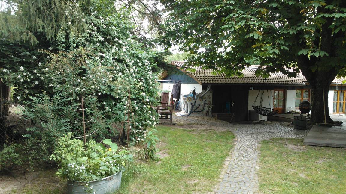 Unser 1.700 m² großes Grundstück hat einen Innenhof, in dem sich eine große Kastanien hoch und breit macht. Hier liegt auch der Eingang zum Studio. Durch einen Torbogen gelangen sie in einen großen naturnahen Garten mit Blumen, Bäumen, Büschen und einem großen und bewohnten Schwimmteich sowie unterschiedlichen Sitzplätzen.