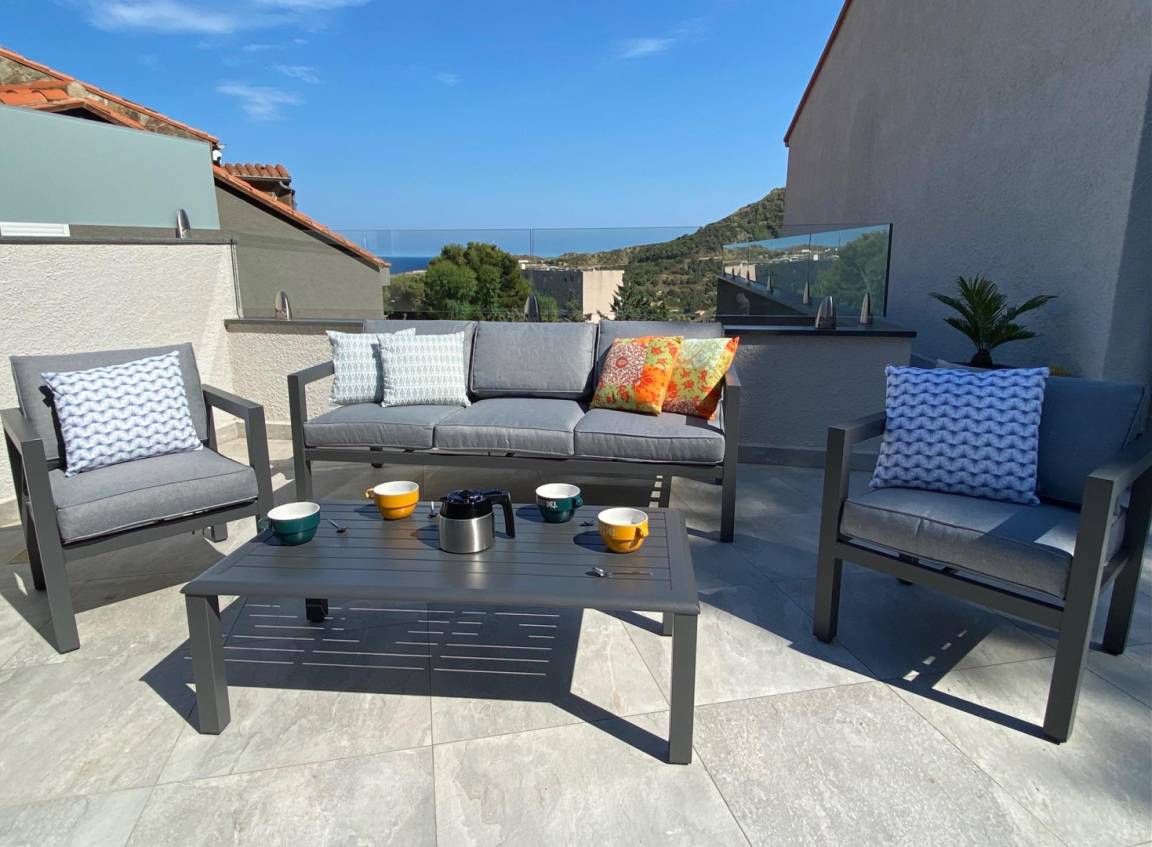„Un très bon accueil dans un logement impeccable avec une terrasse magnifique avec sa plancha où nous avons passé des soirées inoubliables. Proximité du centre ville (5 mn à pied ça grimpe sur le retour !). Nombreuses plages de galets jusqu'à Argelès-sur-Mer.“