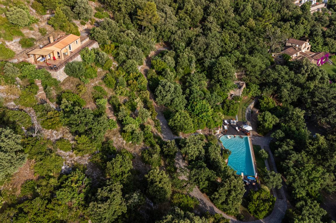 Auf dem sehr weitläufigen, terrassierten Gelände befindet sich die Casetta auf dem höchsten Punkt des Anwesens. Der Pool und das Ferienhaus der Eigentümer liegen auf der Ebene unterhalb der Casetta Lupo. Die Anordnung garantiert den Gästen absolute Privatsphäre im und am Haus. Auch vom Pool ist das Haus der Eigentümer aufgrund der Distanz und der Vegetation nur partiell einsehbar.