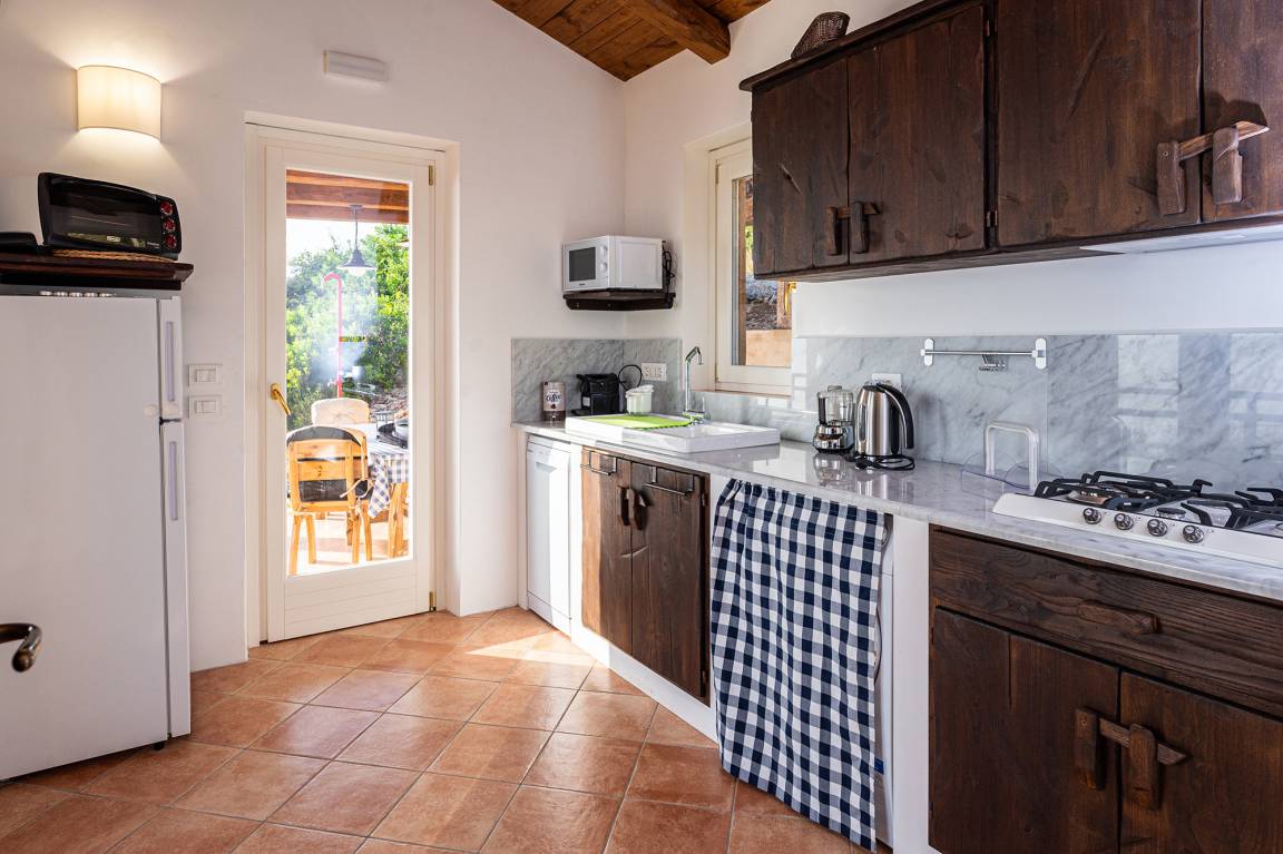 Die gut ausgestattete Küche lädt dazu ein, sich kulinarisch auszuprobieren. Von hier betritt man die Panorama-Terrasse, auf der Sie vor dem Essen, ganz nach italienischer Art, einen Aperitivo mit Meerblick genießen können. Dank der Ausrichtung der teils überdachten Terrasse können Sie während Ihres Aufenthaltes wunderschöne Sonnenuntergänge erleben.