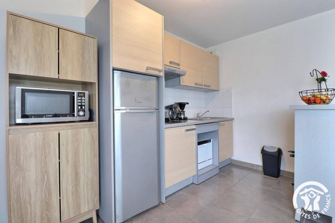 - Wohnzimmer mit Küche, Essbereich und Sitzecke mit Zugang zu einer kleinen, möblierten Terrasse