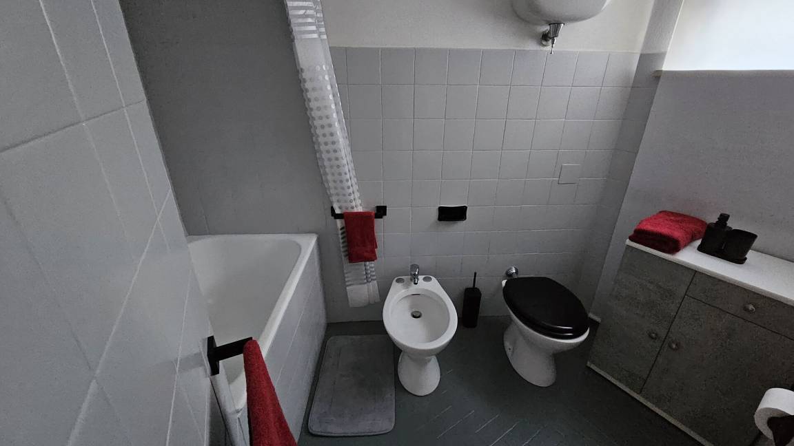Badezimmer: WC, Bidet, Badewanne, Dusche.