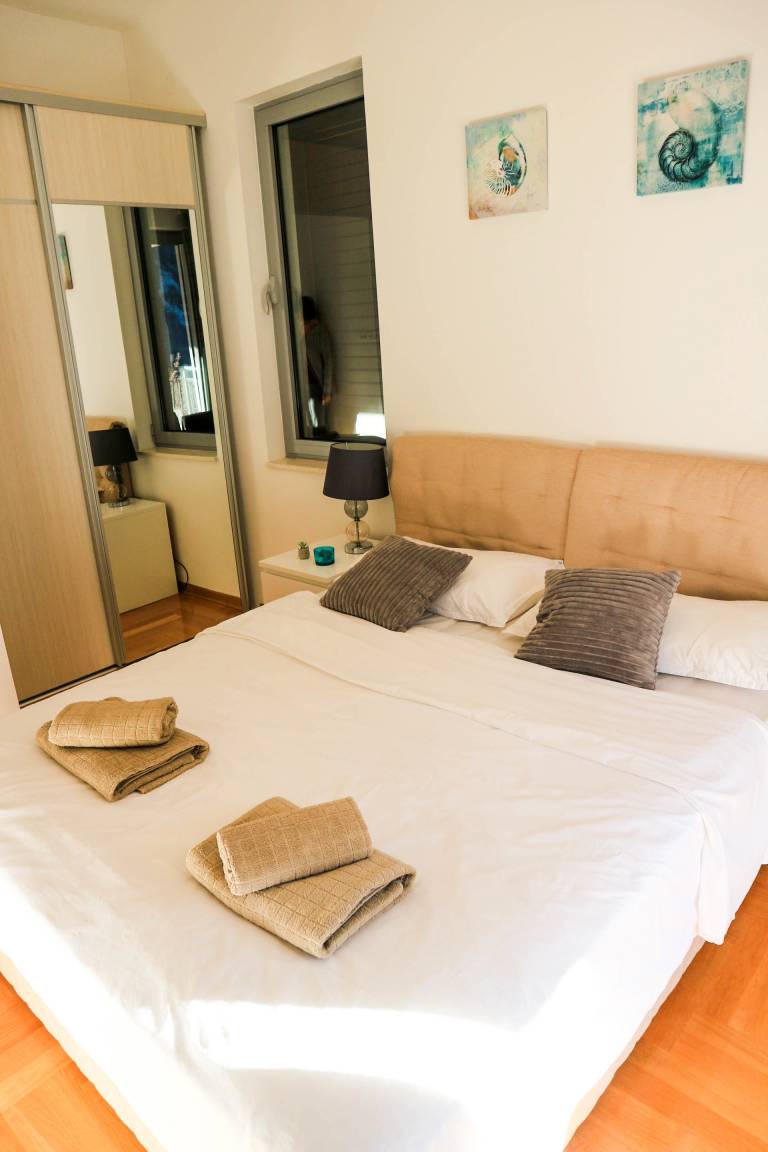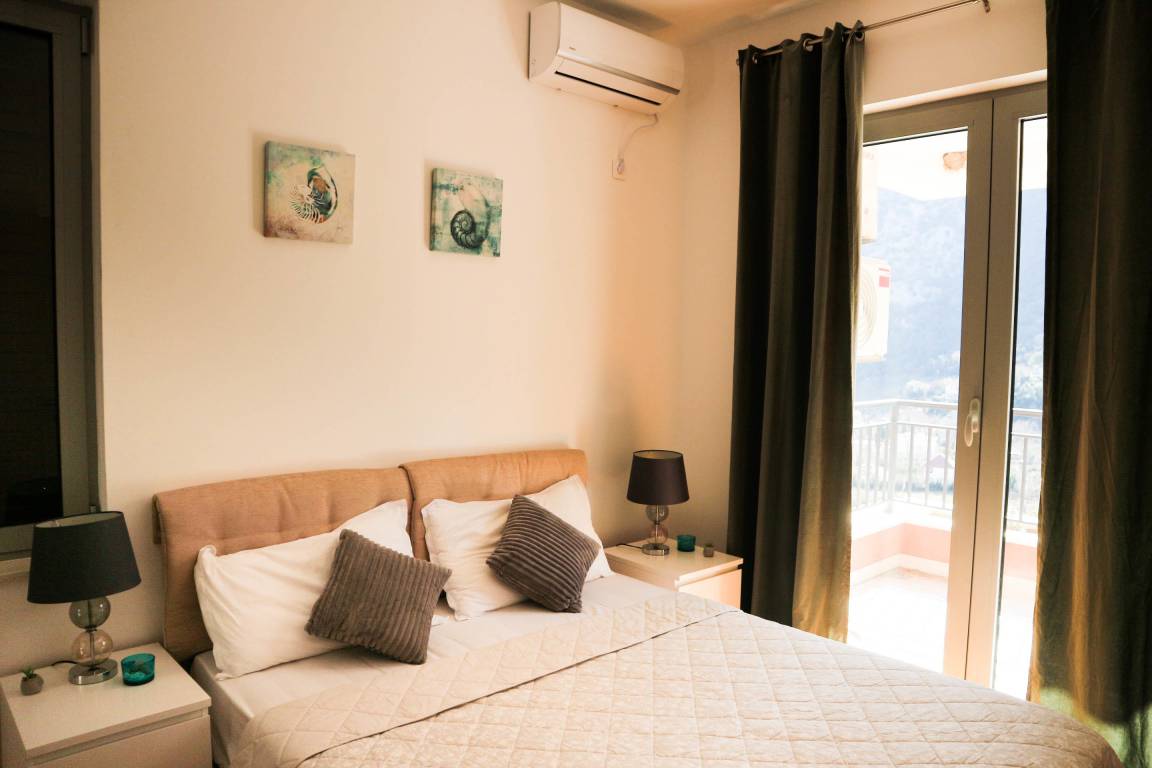 Unsere Ferienwohnung D3 wurde mit 4 Sternen ausgezeichnet und bietet Platz für bis zu 4 Personen. In den 58 qm großen Apartments mit Balkon gibt es einen Wohnbereich mit großer ausziehbarer Schlafcouch und gemütlicher Sitzecke, Kabel-TV mit deutschen und englischen Programmen, eine voll ausgestattete Küchenzeile (Backofen, Herd, Mikrowelle, Wasserkocher, Kühlschrank mit Gefriermöglichkeit, Kaffee- und Teezubehör) und einem Essbereich, ein separates Schlafzimmer mit Doppelbett (Baby-/Kinderbett auf Anfrage), Klimaanlage im Wohn- und Schlafbereich sowie ein Badezimmer mit Badewanne, Fußbodenheizung, Waschmaschine und Bügelmöglichkeit. Vom Balkon aus genießen Sie einen seitlichen Blick auf die Adria, den Strand und das Dorf Morinj.
