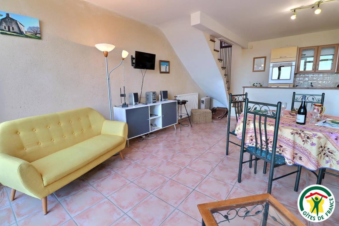 Lichtdurchflutete Unterkunft auf 3 Etagen. Erdgeschoss: gemeinsame Waschküche (Trockner). 1. Stock: Terrasse, Wohnzimmerbereich, Aufenthaltsraum und Küche. 2. Stock: 1 Schlafzimmer mit Zwischengeschoss (1 Bett 140 cm oder 2 Betten 90 cm), Bad (Dusche).