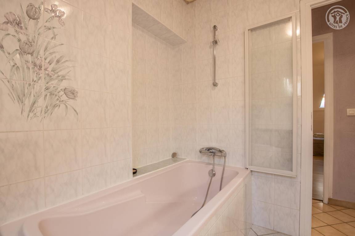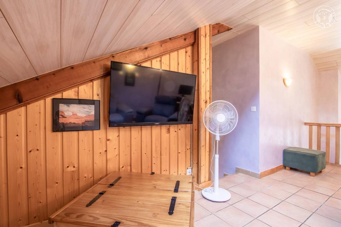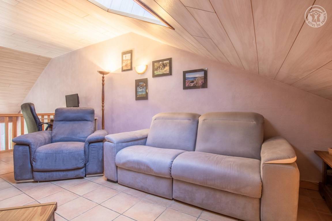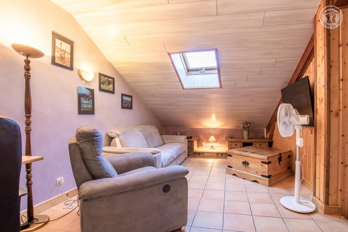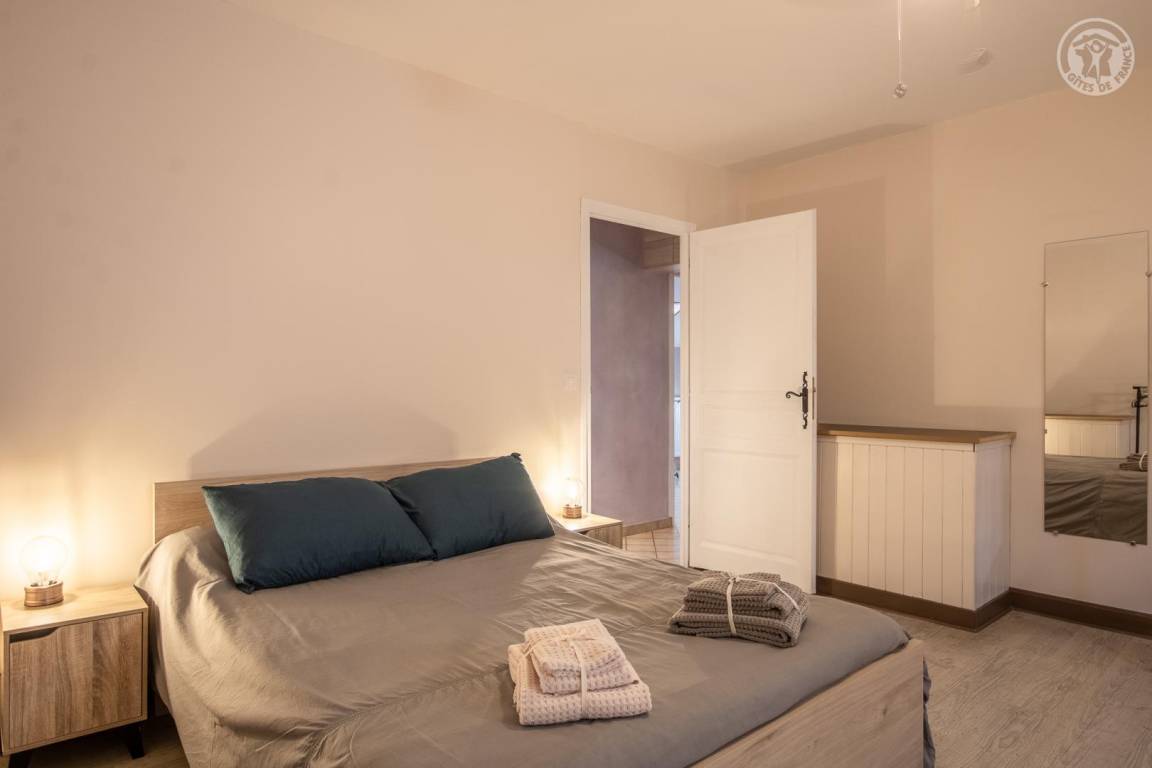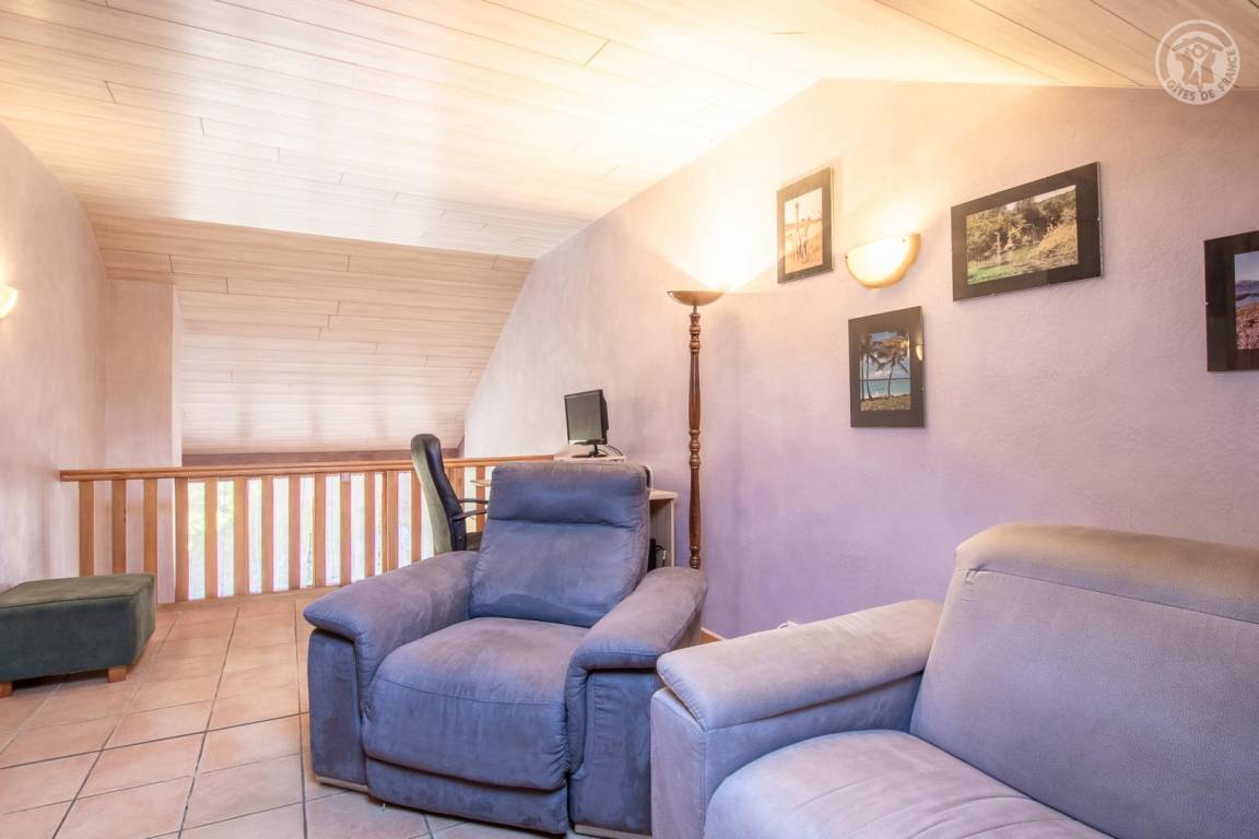 Ferienhaus in einem Haus, das an das der Eigentümer grenzt, auf 2 Ebenen. 1. Stock (unabhängiger Zugang über eine Außentreppe): überdachte Terrasse, Wohnzimmer-Küche, Waschküche. 2. Stock: Mezzanine mit freiem Raum über dem Wohnzimmer, umgewandelt in einen Loungebereich (angeschlossener Fernseher mit internationalen Kanälen, Radios, Netflix usw.), 3 Schlafzimmer (2 Einzelbetten 90x190 cm und 1 Doppelbett 140x190 cm / 1 Doppelbett 160x200 cm / 1 Doppelbett 140x190 cm), ein Badezimmer (Badewanne mit Duschstange), separates WC mit Waschbecken. Gemeinsamkeit. Privater Parkplatz für 2 Autos.