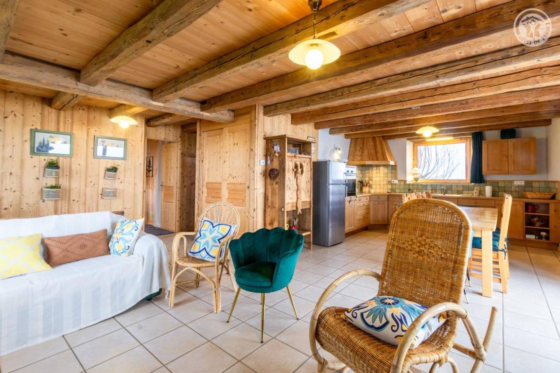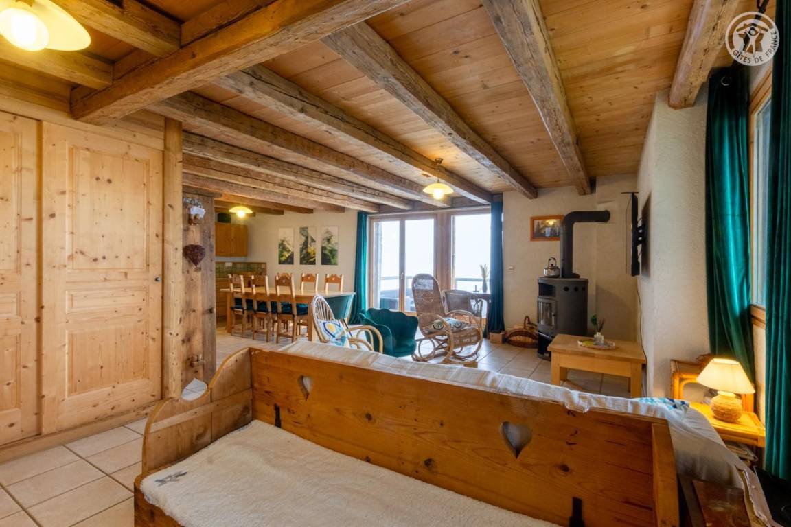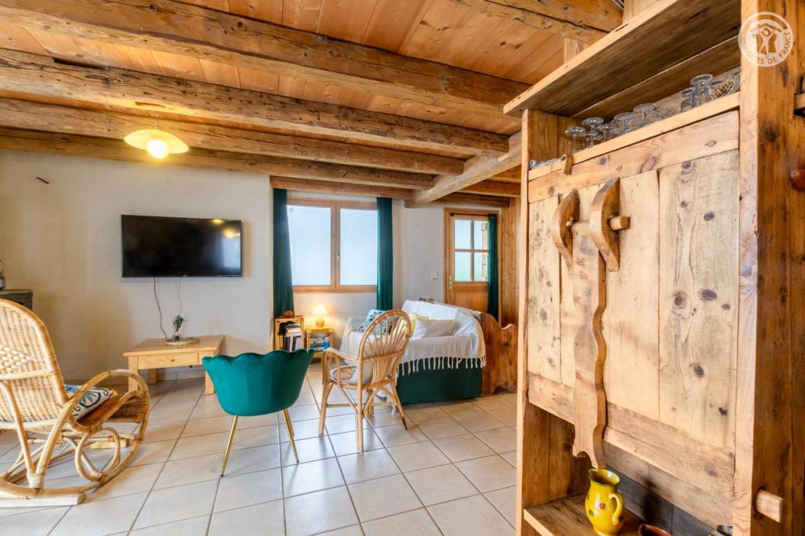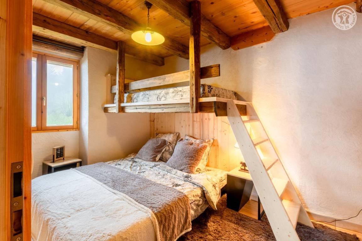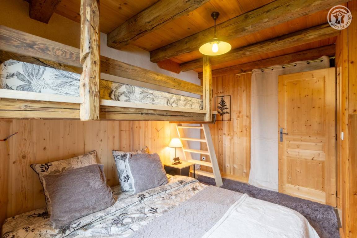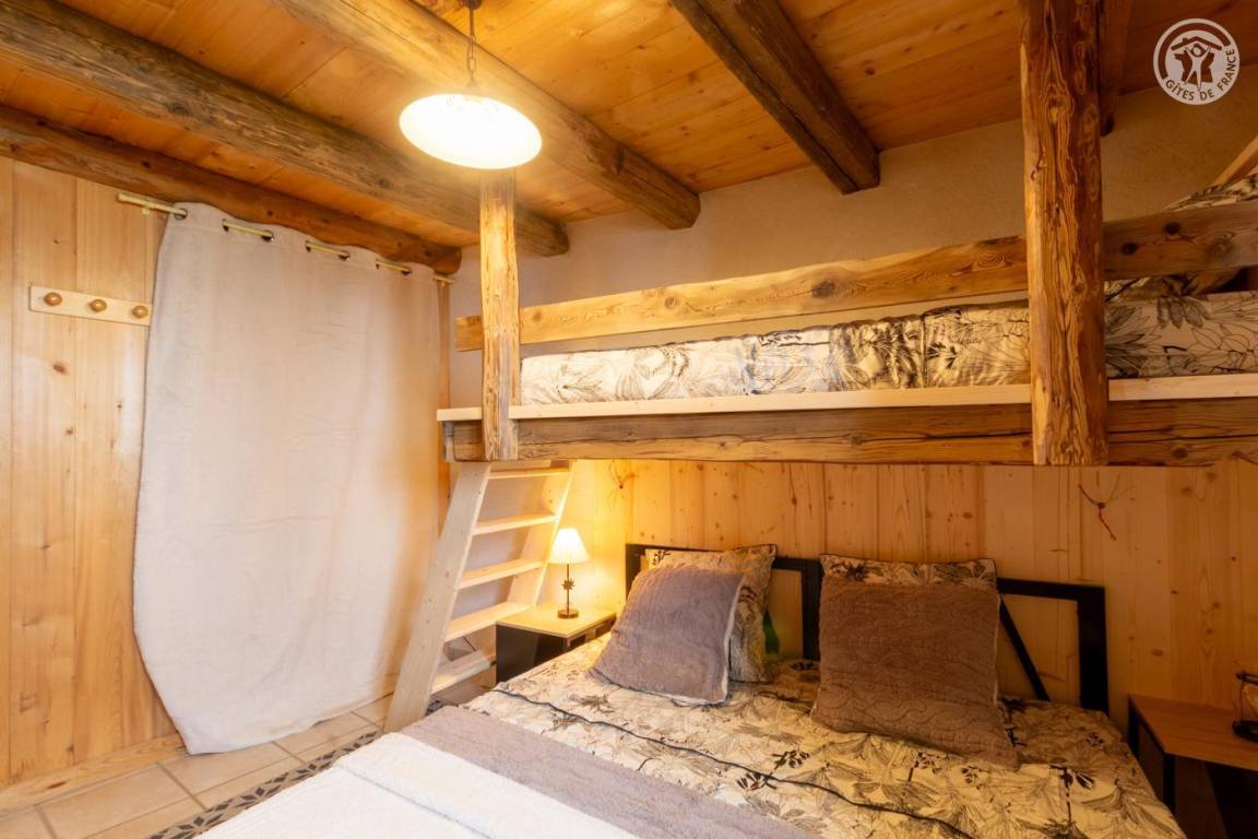 Alpenchalet am Berghang. Zugang zur Gîte über einen abfallenden Grasweg. Eingang, Wohnzimmer, Wohnzimmer, Küche mit Zugang zur Balkon-Terrasse, 2 Schlafzimmer (1 Doppelbett 180 x 200 cm und 1 Einzel-Etagenbett 90 x 190 cm / 1 Doppelbett 180 x 200 cm und 1 Einzel-Etagenbett 90 x 190 cm), Badezimmer (Dusche im italienischen Stil). ), separates WC. Zufahrt zum Chalet über eine befahrbare Straße über einige Kilometer. Es besteht die Möglichkeit, bei der An- und Abreise mit den Eigentümern zum Chalet hinaufzusteigen. Völlige Autonomie für die Dauer des Aufenthalts. Bettwäsche und Handtücher inklusive. Bei Bedarf Parkplatz 50 Meter oberhalb der Unterkunft.